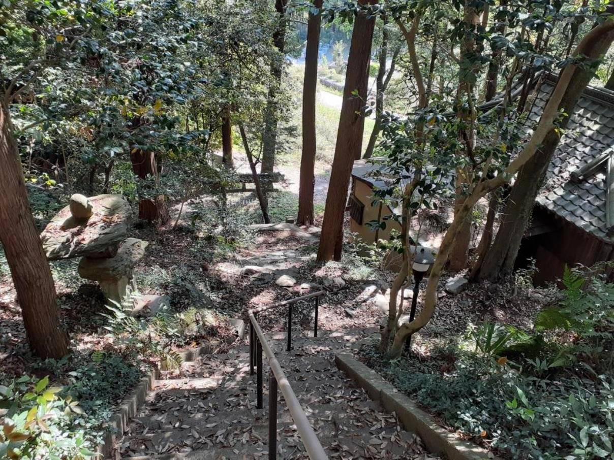 拝殿左側には雀川の渓谷で形成された岩石、巨石があり、その異様な光景は圧巻である(写真左)。本殿は拝殿左側の石段を登った上に鎮座している(同右)。