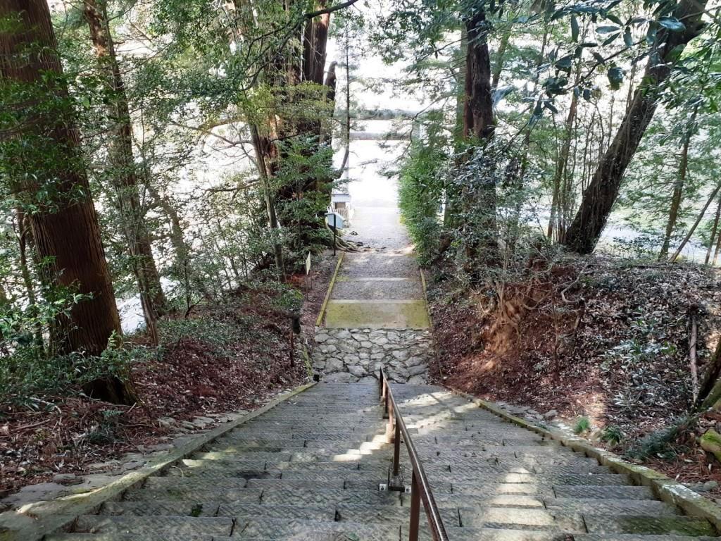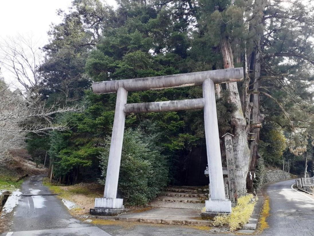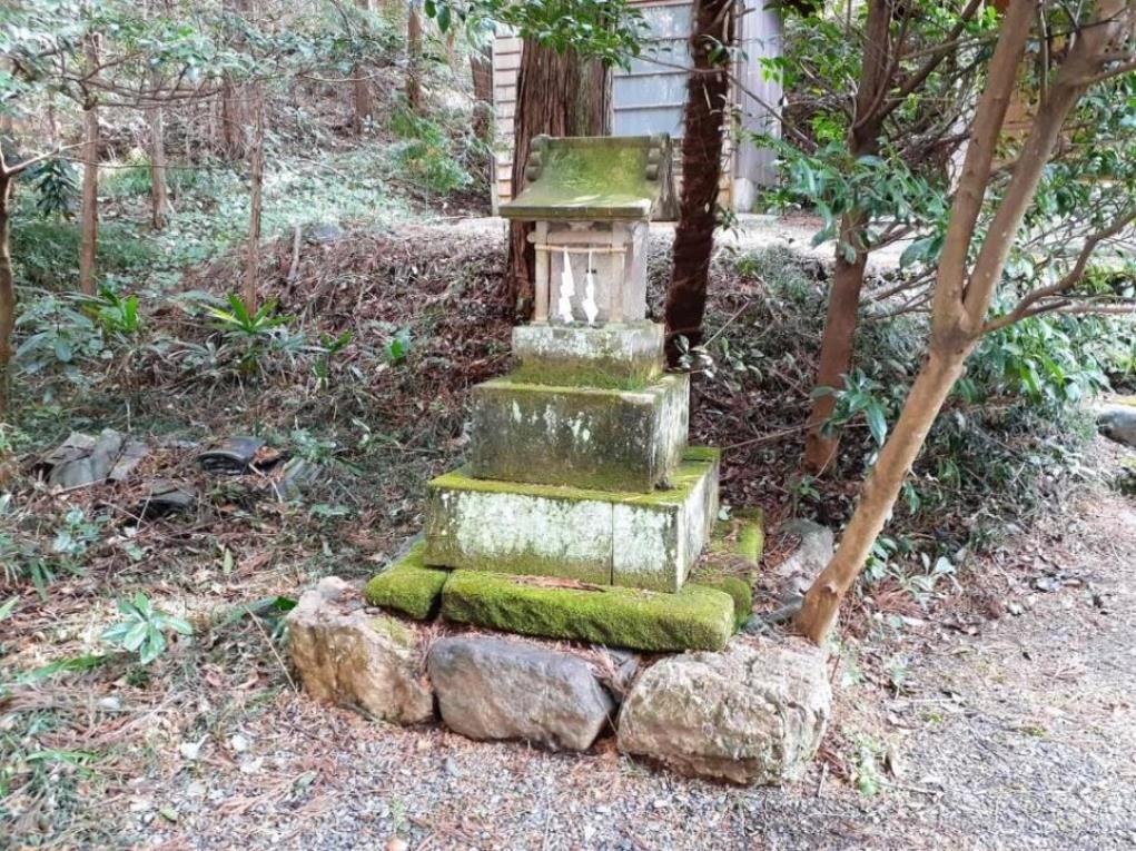 本殿の敷地には、拝殿に通じる南北の石段の他に、東側にも石段があり(写真左)、その先には古く、今にも崩壊しそうな両部鳥居が立っている(同右)。因みにこの鳥居の右手奥に境内社が鎮座している。