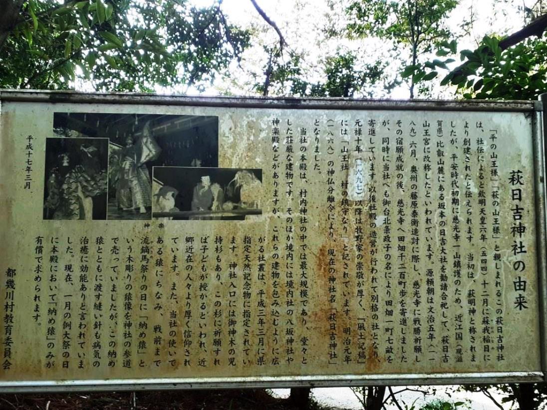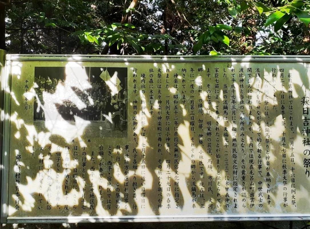 現在この社は同町萩日吉神社が管理しているようだ。この萩日吉神社では3年に1回流鏑馬祭りが奉納されているが、この社も嘗て明治時代まで祭礼には古式流鏑馬の神賑行事があったが、日露戦争の頃馬不足のため休止し、その後これに替えて地方競馬が行われていたと伝えられ、未だにその馬場跡が残っているという。