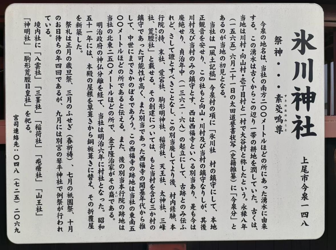 当社は『風土記稿』今泉村の項に「氷川社 村の鎮守にして、本地正観音を安せり、この社もと向山・川村及び当村の鎮守なりしが、其後川村及び当村のみの鎮守とす、古は西福寺といへる別当あり、是も今は廃絶せり、貞治年中(一三六三-六八)の起立にして、古跡とのみ伝ふれど、さして證とすべきことなし、この別当廃してより後村内修験、本行院の持、末社、愛宕社、駒形明神社、稲荷社、天王社、太神社、三峰社、荒脛社」と載せる。
