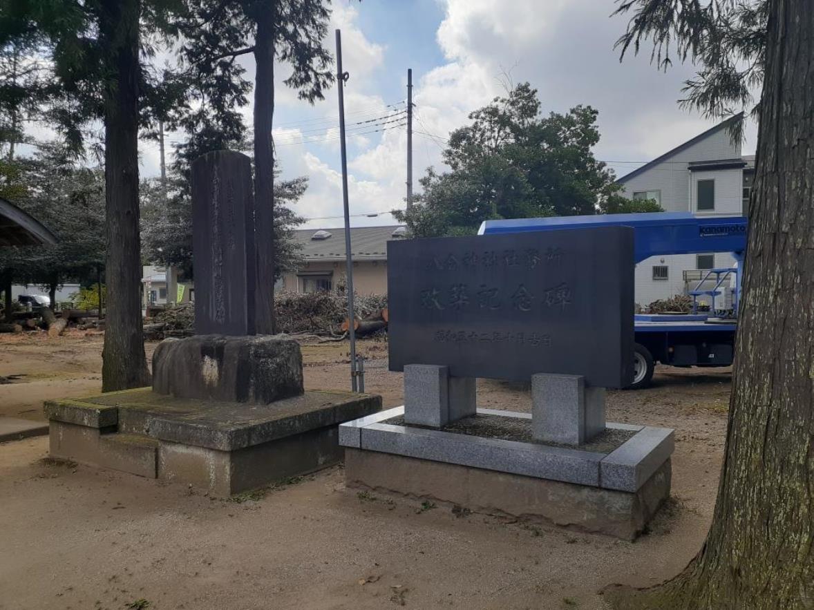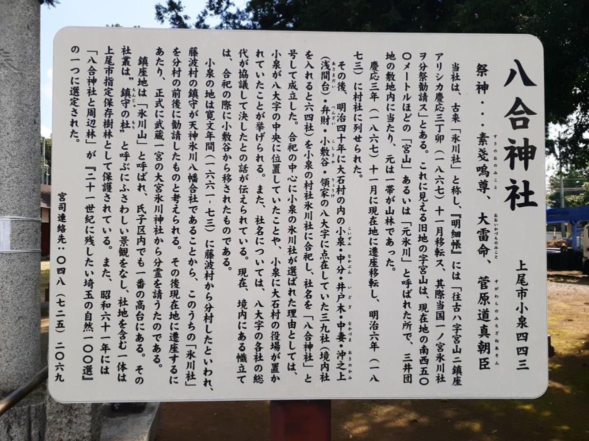 その後、明治四十年に大石村の小泉(こいずみ)・中分(なかぶん)・井戸木(いどぎ)・中妻(なかづま)・沖之上(おきのかみ)・浅間台(あさまだい)・弁財(べんざい)・小敷谷(こしきや)・領家(りょうけ)の八大字に点在していた三九社(境内社を入れると六四社)を小泉の村社氷川社に合祀し、社名を「八合神社」と号して成立した。合祀の中心に小泉の氷川社が選ばれた理由としては、小泉が八大字の中央に位置していたことや、小泉に大石村の役場が置かれていたことが挙げられる。また、社名については、八大字の各社の総代が協議して決したとの話が伝えられている。現在、境内にある幟立ては、合祀の際に小敷谷から移されたものである。