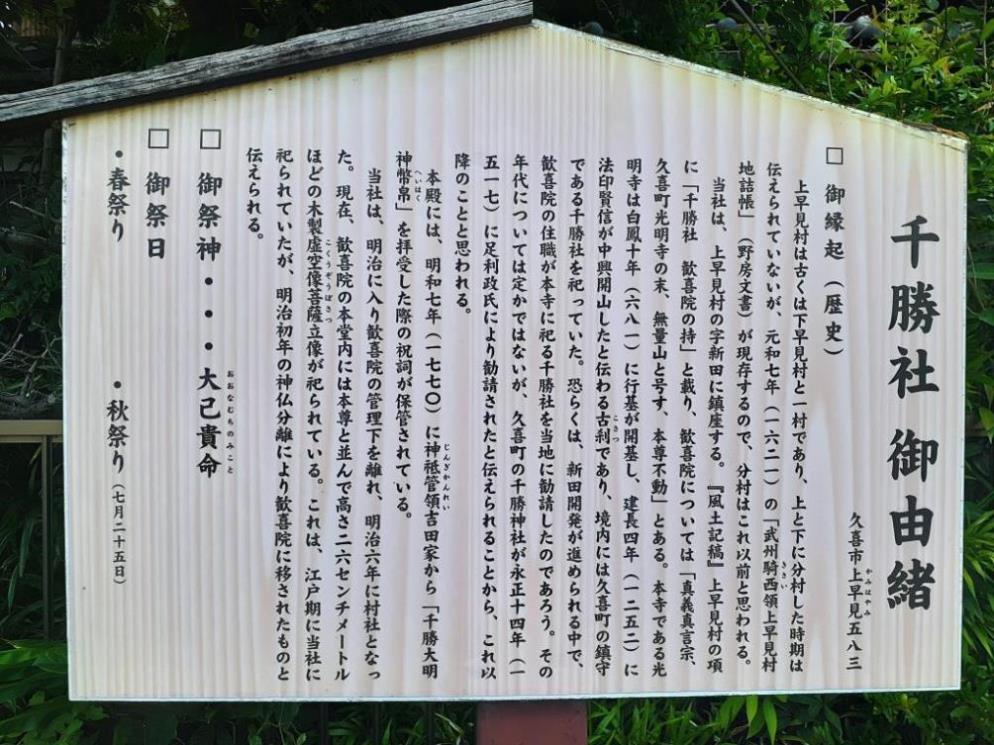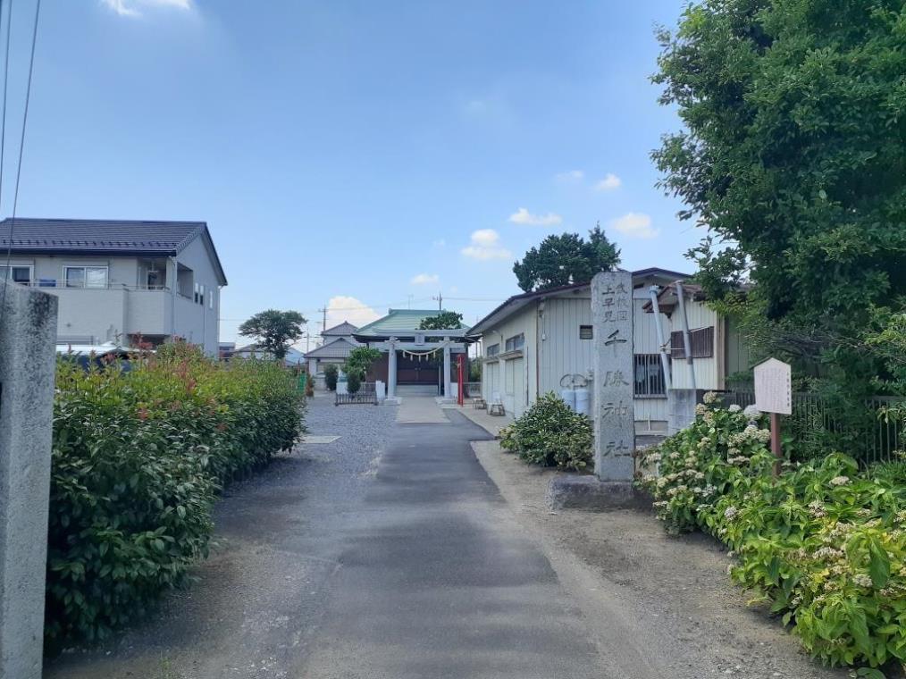 久喜市下清久地域は、古利根川の乱流期に形づけられた自然堤防上に位置していて、青毛堀川と備前前堀川の間の低地・台地に位置する農耕地帯である。地域東側には南北方向に蛇行しながら流れる新川用水が上早見地域との境となっていて、地図を確認すると、上早見千勝神社から新川用水を隔ててほぼ真北に下清久諏訪神社は鎮座している位置関係となっていて、この二社は直線距離にして200mも離れていない。