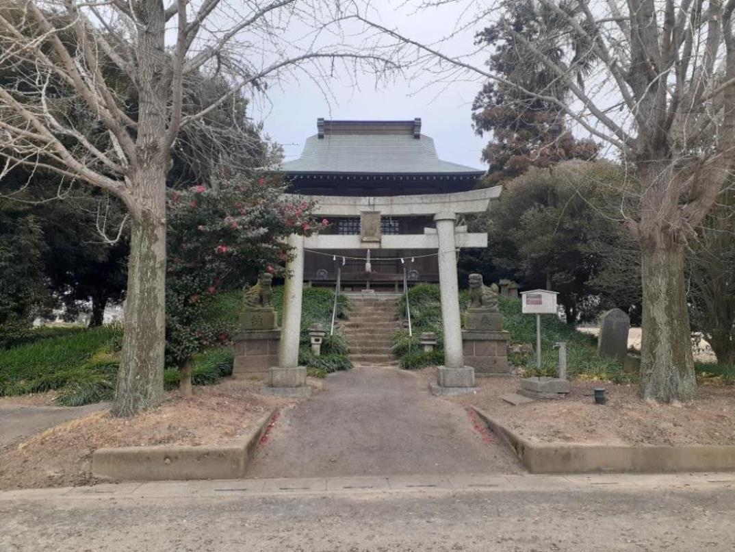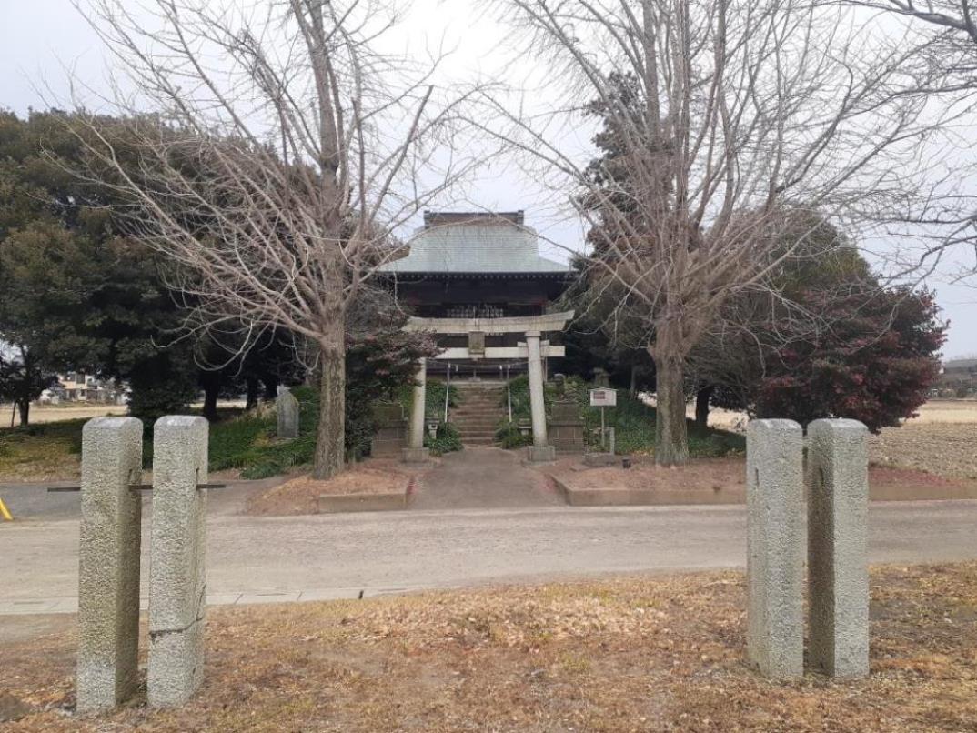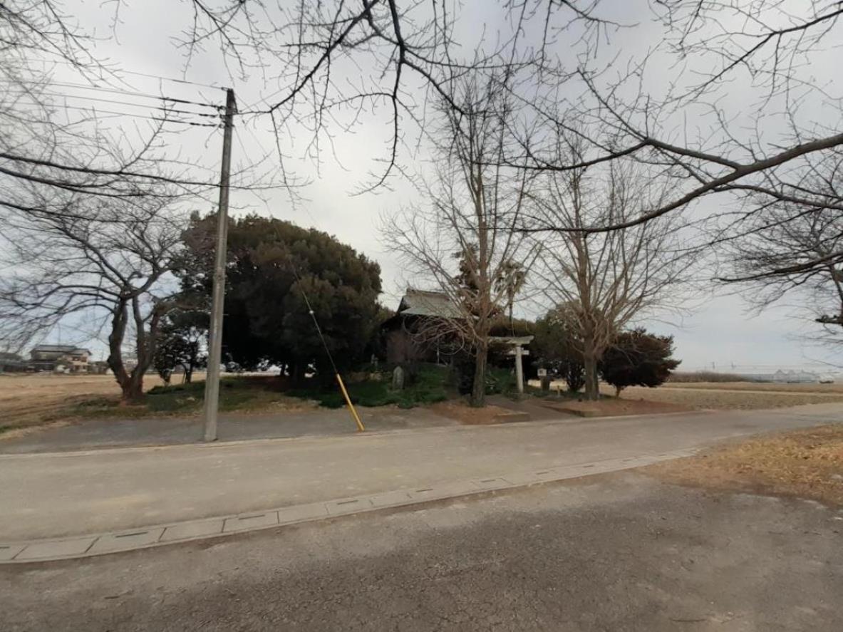 麦倉八坂神社から利根川に沿って走る埼玉県道368号飯積向古河線を程東行する。進行方向右手には利根川の土手が延々と続き、対して左手は民家が点々と見える以外は長閑な田畑風景が広がる里風景を眺めながら、1.2㎞程行った先の十字路を左折し、北上する。暫く進むと進行方向右手前方に、田畑風景の中にポツンとこんもりとした栄鷲神社の社叢林が見えてくる。