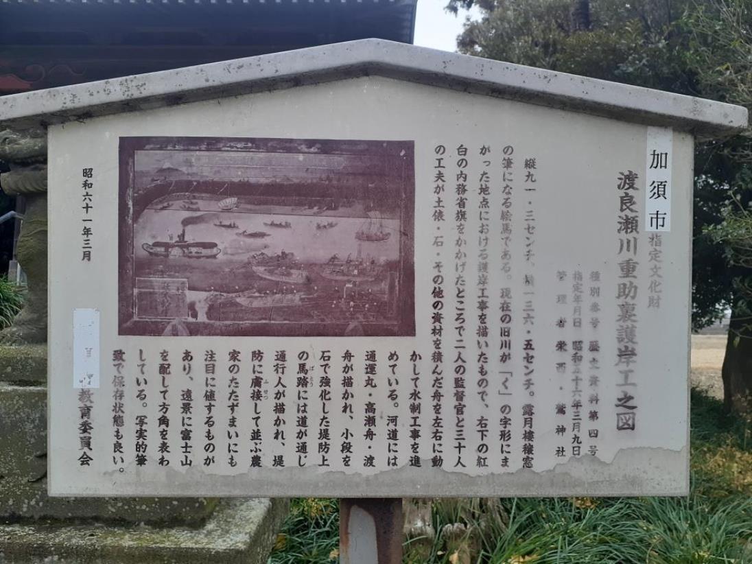 縦九一・三センチ、横一三六・五センチ。露月樓穣窓の筆になる絵馬である。現在の旧川が「く」の字形にまがった地点における護岸工事を描いたもので、右下の紅白の内務省旗をかかげたところで二人の監督官と三十人の工夫が土俵・石・その他の資材を積んだ舟を左右に動かして水制工事を進めている。河道には通運丸・高瀬舟・渡舟が描かれ、小段を石で強化した堤防上の馬踏には道が通じ通行人が描かれ、堤防に膚接して並ぶ農家のたたずまいにも注目に値するものがあり、遠景に富士山を配して方角を表わしている。写実的筆致で保存状態も良い(以下略)