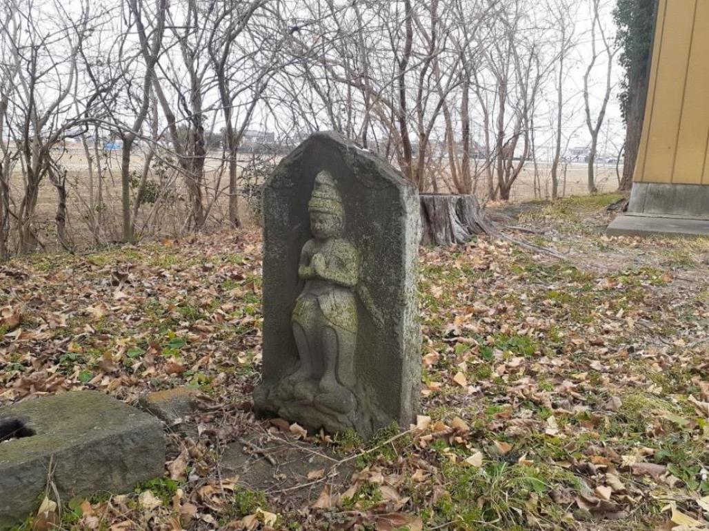 拝殿手前左側にある「青面金剛像」 「青面金剛像」の右側に並ぶ菩薩像等