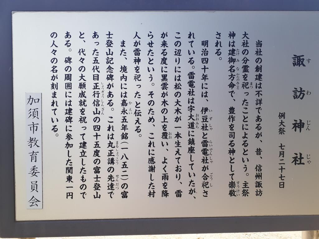 明治四〇年に字当開戸の久伊豆社と字大同の雷電社を合祀した。このうち、雷電社は現在も旧地に石宮が残っている。以前ここには松の大木が一本生えていたことから、この辺を一本木耕地と称し、雷が来る度に黒雲が松の上を覆い、よく雨を降らせたという。そのため、このあたりの地主三名は雷神に感謝し、明治一七年に石宮を建立している。