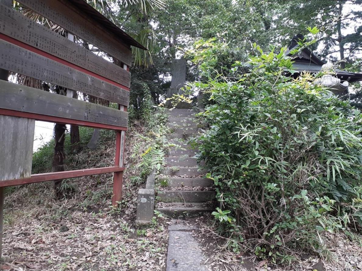 社殿左側隅には石碑が四基あり、社殿側から「日露戦没記念碑」(写真左)、「敷石記念碑」、「大東亜戦争記念碑」(同右)、「久伊豆神社 大鳥居記念碑」が建っている。