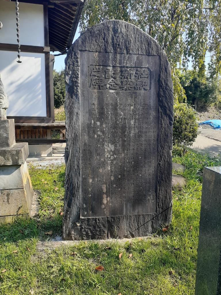 茲に社殿再建に至る経緯の概略を刻し、この地域伝統の文化を後世に伝えるとともに併せて御祭神の御神徳を広く宣揚する事を祈念して建立するものである。(以下略)