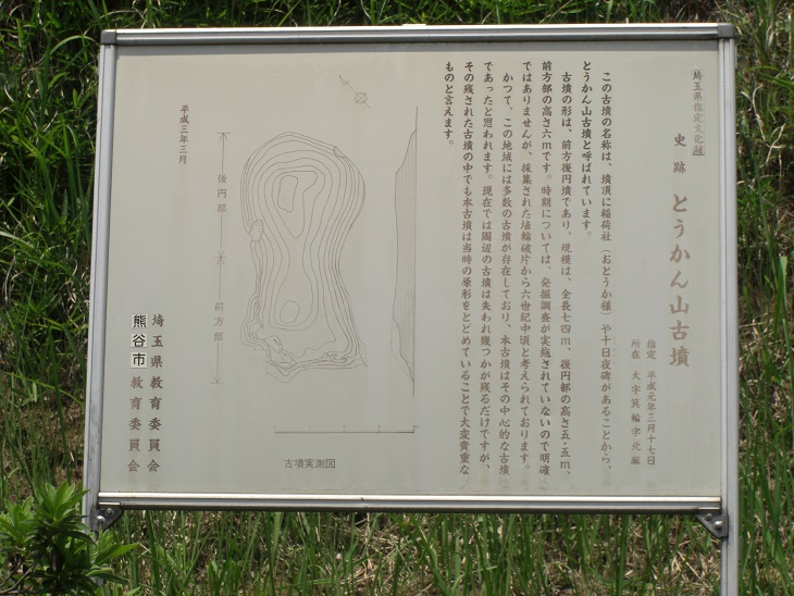 とうかん山古墳は冑山神社、同古墳から北へ2㎞位進んだ箕輪地区にある前方後円墳である。冑山神社は国道407号線沿いに鎮座しているが、その国道の東側に走っている埼玉県道257号冑山熊谷線を熊谷市方向に北上すると右側に吉見小学校があり、その手前にとうかん山古墳が見えてくる。