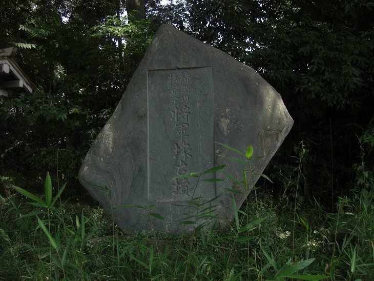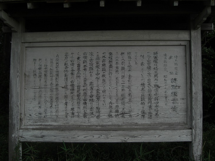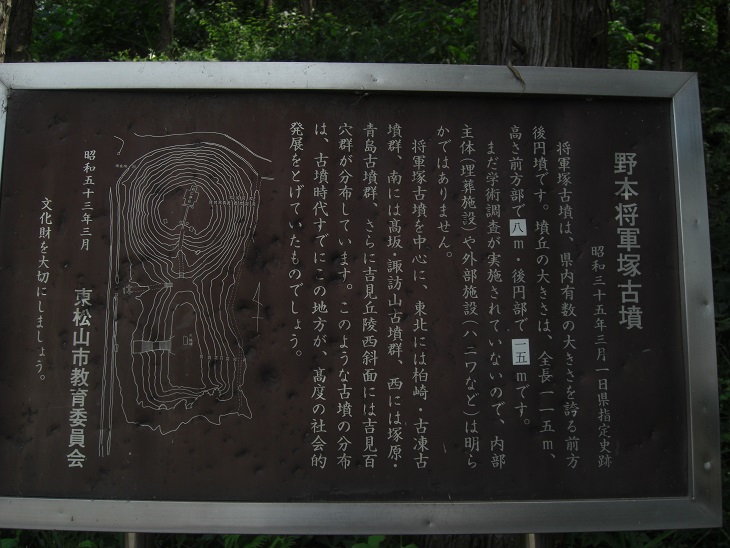 県道345号小八林久保田下青鳥線の脇に、古墳銘を刻んだ石碑が建っていて、その横のかなり薄くなって見づらくなった案内板がある。よく目をこらして見ると、野本将軍塚古墳は昭和35年(1960)3月1日に県の史跡に指定された。また全長115mの墳丘は、武蔵國でも最大規模の二子山古墳(埼玉古墳群)に匹敵する大きさだが、なんでも明治の末に、隣接する旧野本小学校の敷地を拡大するために先端部の封土が大量に削り取られてしまったことが知られているので、復元すると埼玉古墳群の二子山古墳を凌駕する可能性もあるそうである。この古墳の築造時期は最近の推定では二子山古墳よりかなり古い前期古墳と考えられていて、そうであれば、築造当時は北武蔵で最大の墳墓であったことになる。