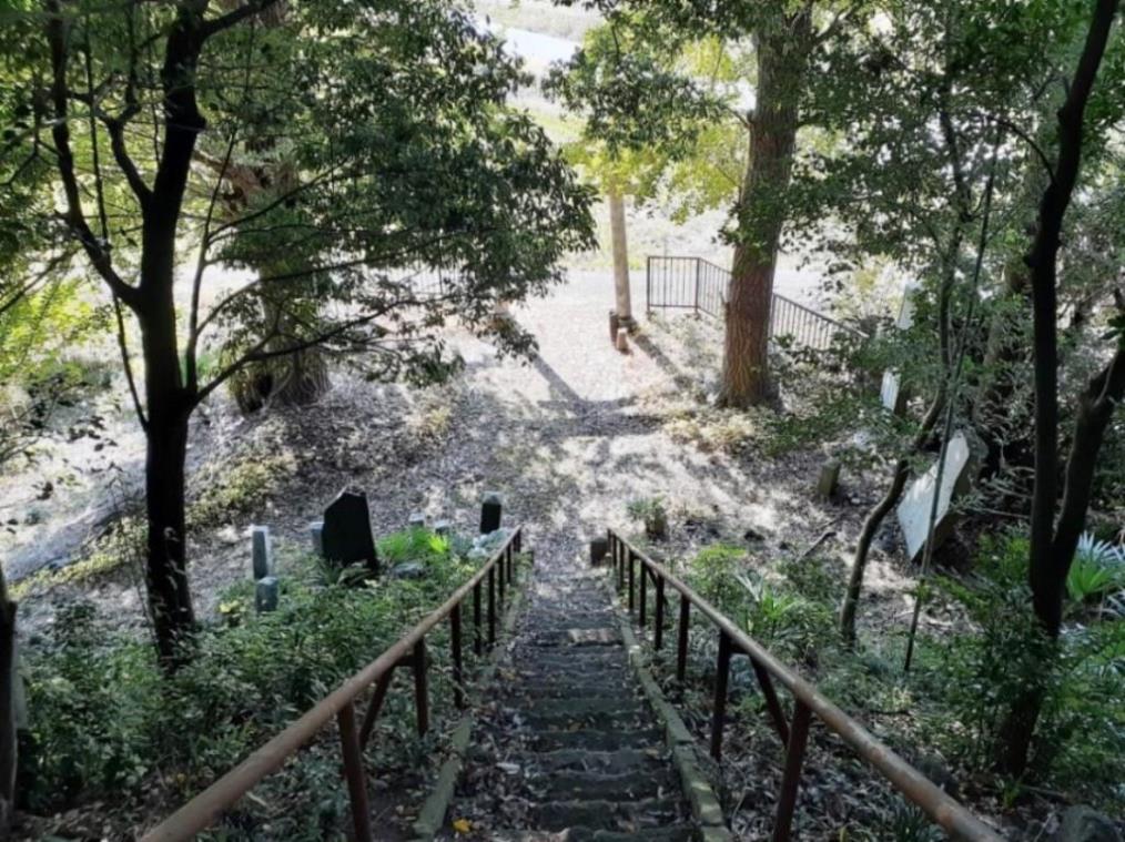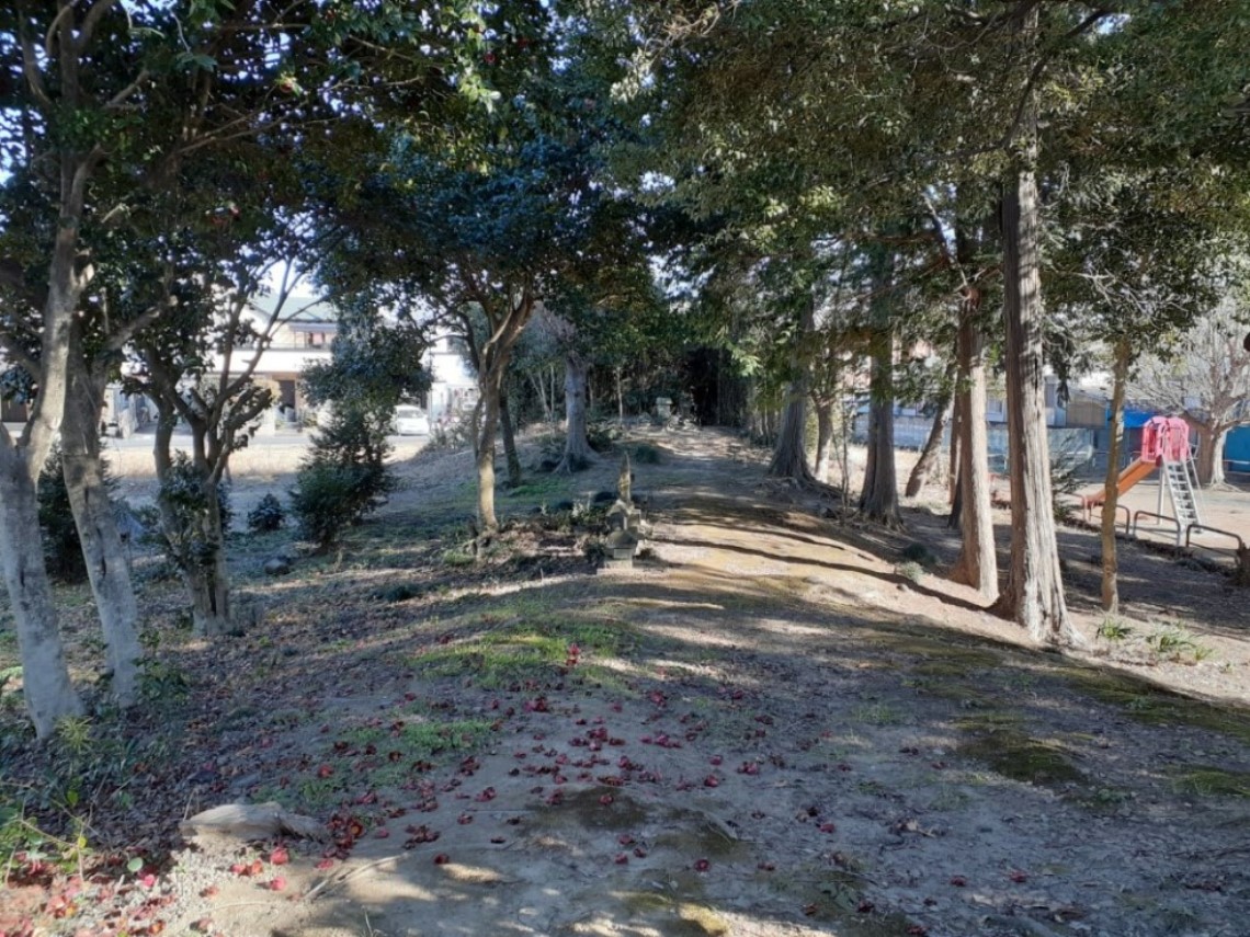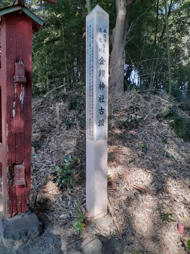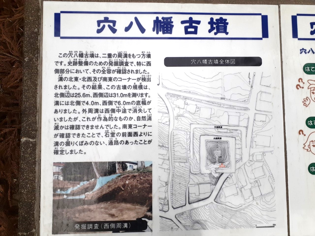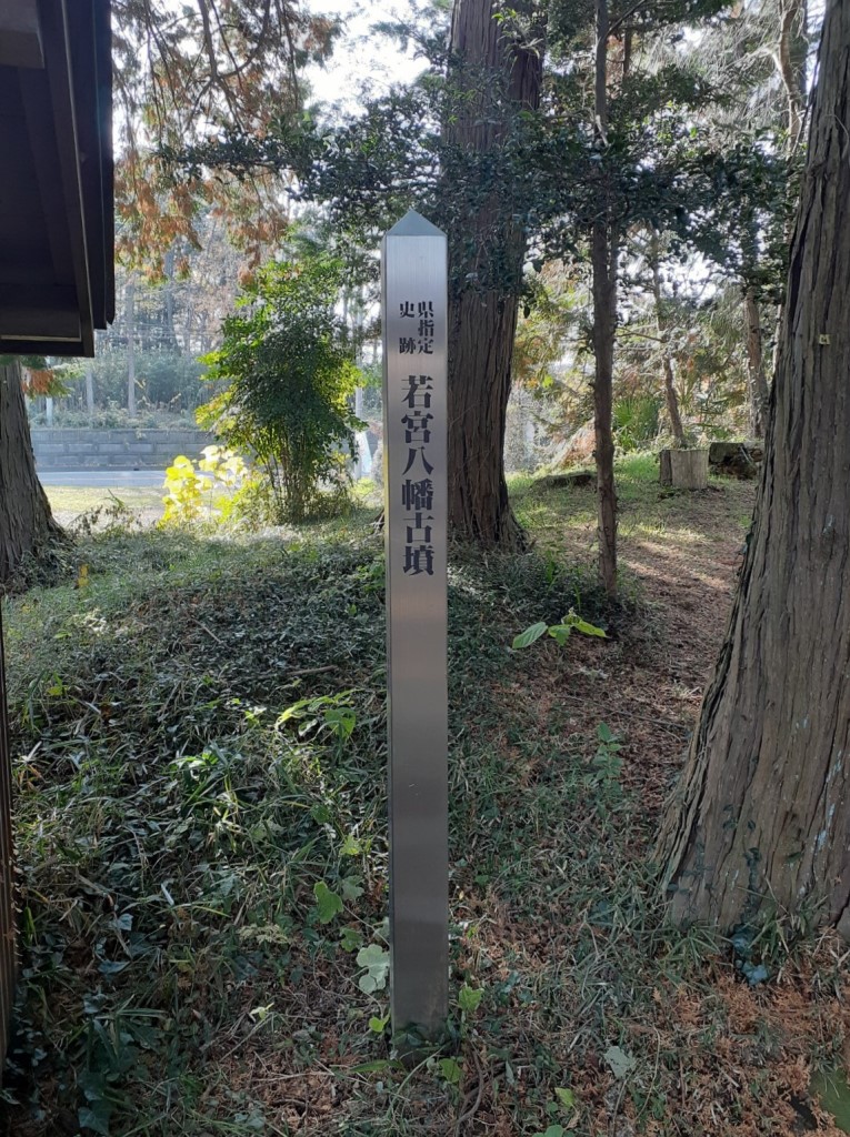 若宮八幡古墳の開口場所は八幡神社由緒書の案内板を左方向に進むと見えてくる。進行方向途中左側に「県指定史跡 若宮八幡古墳」の標柱が建っていて、そのまま進むと古墳の玄室で開口部が見えてくる。