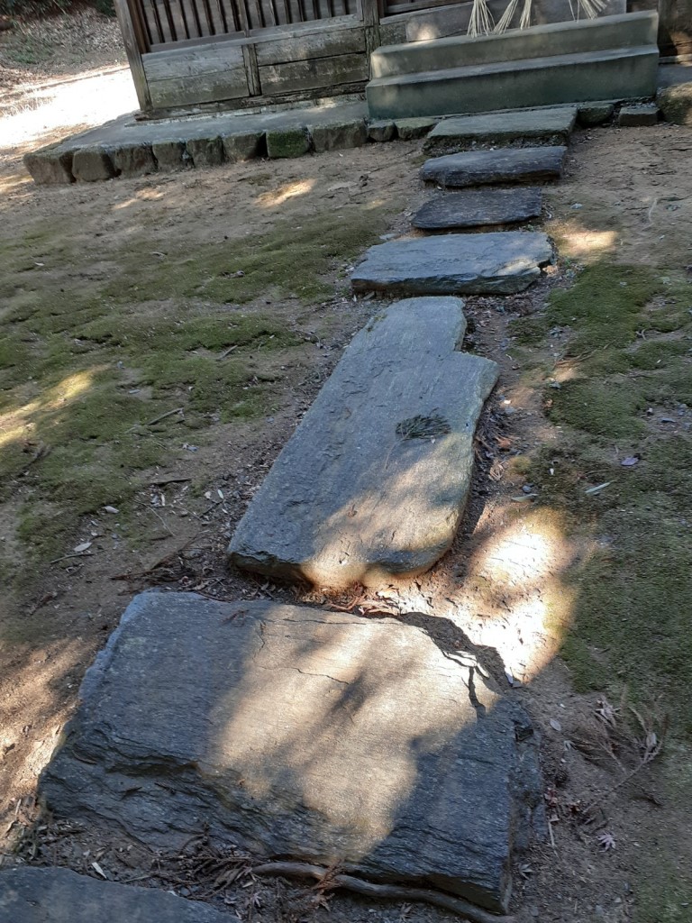 玄室開口部は南西方向を向いていて、石橋若宮八幡神社の参道や社殿の軸線に対して、左側方向に30度〜40度程ずれて開口されている(写真左)。開口部には格子扉があり施錠されていて、中を覗いても真っ暗であるが、すぐ傍に石室の中を照らす電灯のスイッチがあり、奥端部まで観察することができた(写真右)。