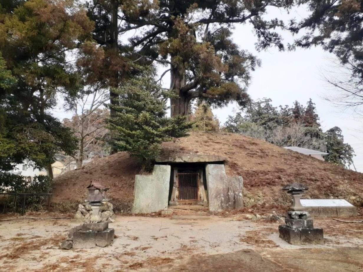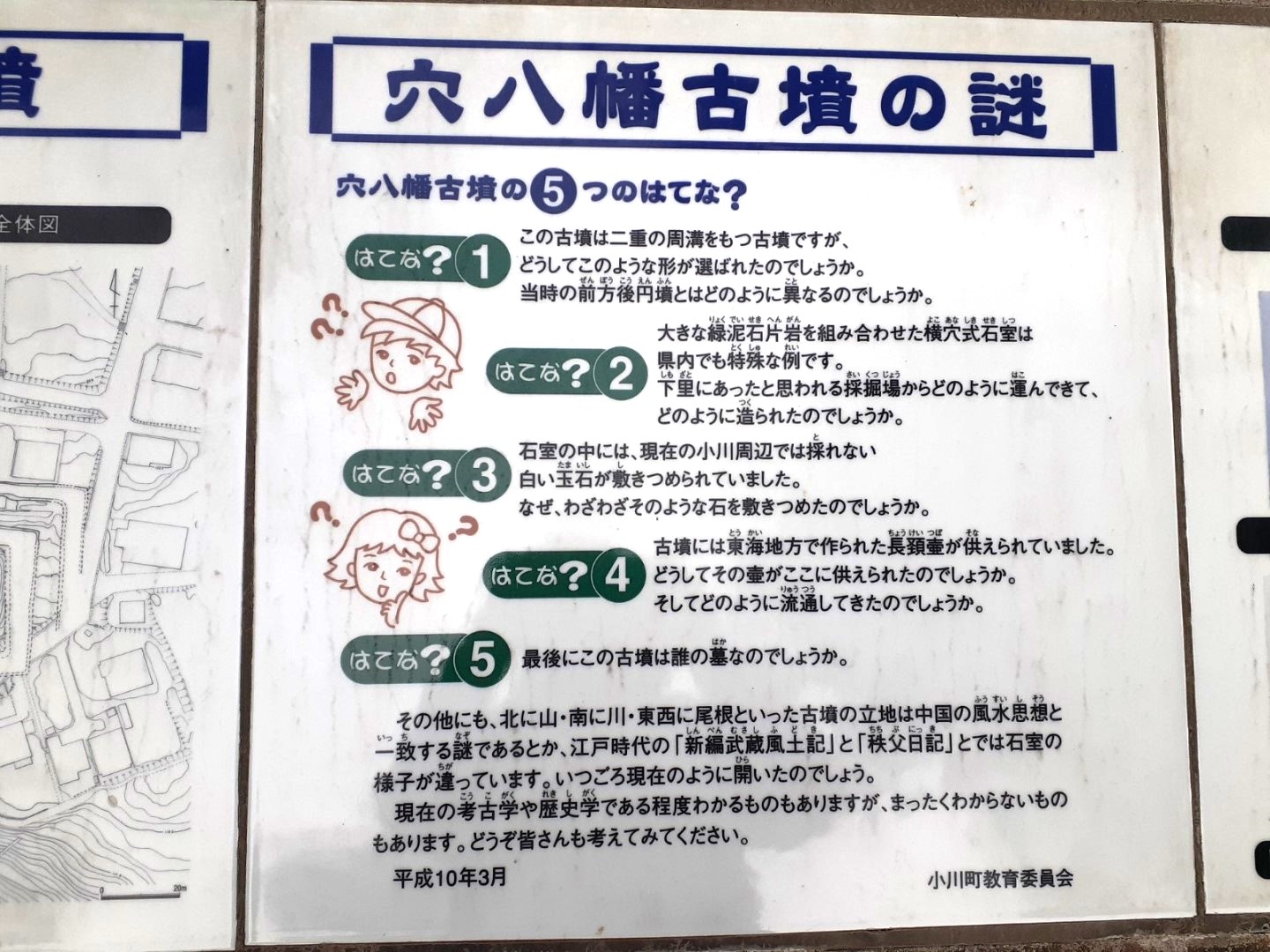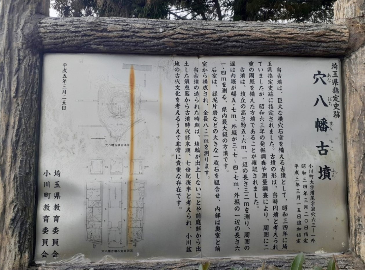 平成二十二、二十三年の修復保存整備に伴って行われた調査では、地表面に整地土を敷き平らに固めた後に、根石と言われる基礎になる石を設置していることや天井石が厚いかまぼこ型をした砂質凝灰岩であることが新たに判りました。(平成24年度3月 東松山市教育委員会) 案内板より引用