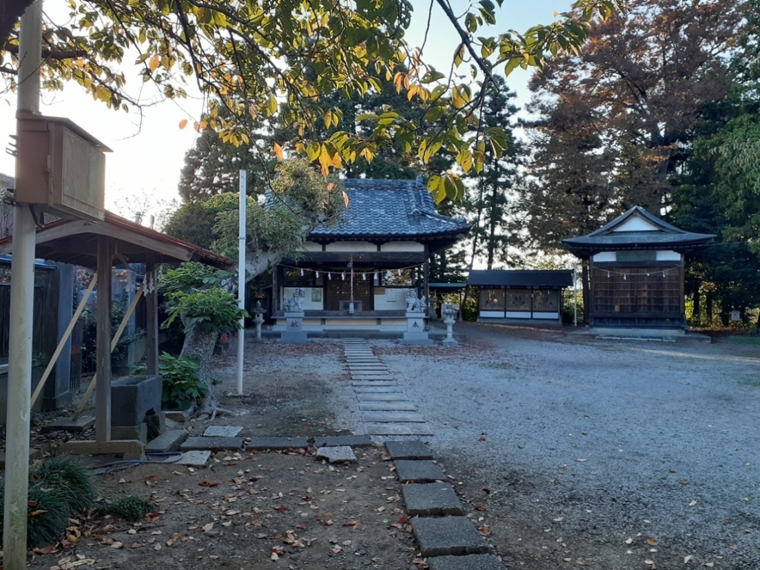 正面に立つ鳥居と社の境内北側に隣接する「坂戸市消防団大家分団第3部」との間に境内に通じる舗装されていない道があり、そこに移動し、撮影等に支障にない場所に車を停めてから参拝を開始した。