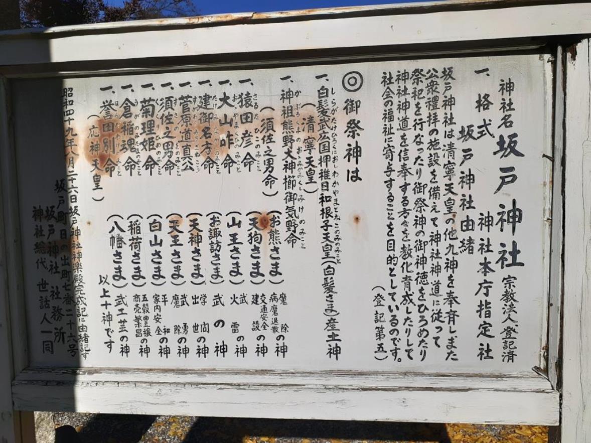 また、同一七年(一八八四)には、坂戸駅付近の導願山に遷座して清寧天皇(白髪明神)・猿田彦命(白髭明神)の二神を主祭神とし、同時に稲荷前の熊野社、堀ノ内の諏訪社、天神前の天神社の三社を合祀し、五社様と尊称され、氏子区域も広がり盛大に祭祀を営みました。更に、同四十年(一九〇七)には日枝前の日枝・白山社、八坂社、これに加え、粟生田の稲荷社、上吉田の諏訪社・天神八幡社を合祀し、現在の鎮座地である字日枝前に遷座し、氏子区域は広大となり、祭祀も更に増え、厳粛・盛大に執行されました。本殿は神明造りで御扉が五箇所ある、いわゆる相殿五座で一座ごとに二神を奉斎します。第一座は主祭神、壱番神「清寧天皇」、弐番神「猿田彦命」。第二座よりは合祀神、参番神「神祖熊野大神櫛御気野命」、四番神「建御名方命」。第三座は五番神「菅原道真公」、六番神「大山咋命」。第四座は七番神「菊理姫命」、八番神「須佐之男命」。第五座は九番神「倉稲魂命」、拾番神「誉田別命」の十神(拾神 とかみ)です。そして、同年には社号も「白髪社」から現在の「坂戸神社」に改められ、境内も一段と整備されました。(中略)