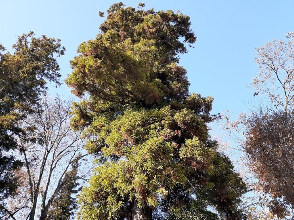 参道右側にある手水舎奥に聳え立つご神木(写真左・右)