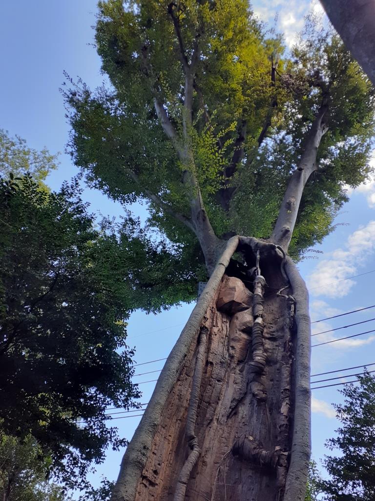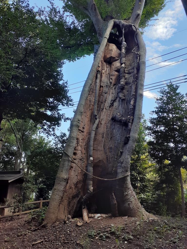 このご神木である大欅(ケヤキ)は樹齢900年余りで、現在の樹高は約17m幹周りは約7mの巨木である。昭和7年に指定された当時は樹高が約36mで、枝も四方に生い茂っていた。しかし、昭和47年に風雨と自らの重さにより枝周り3mもの大枝が折れてしまった。このため幹の空洞部分を覆い、さらに東面の残った大枝を鉄柱で支える措置を講じられている。また、平成6~7年度にわたり樹勢回復のため腐朽部分の除去や樹脂補填等を行い、その後、平成18年度には、木の成長とともに前回の樹勢回復業務における樹木と樹脂の接合部分に剥離が生じた箇所の補修や、菌などの繁殖を抑えるため、日照、風通しを良好に保つための周辺環境も整備し、今日に至っているという。