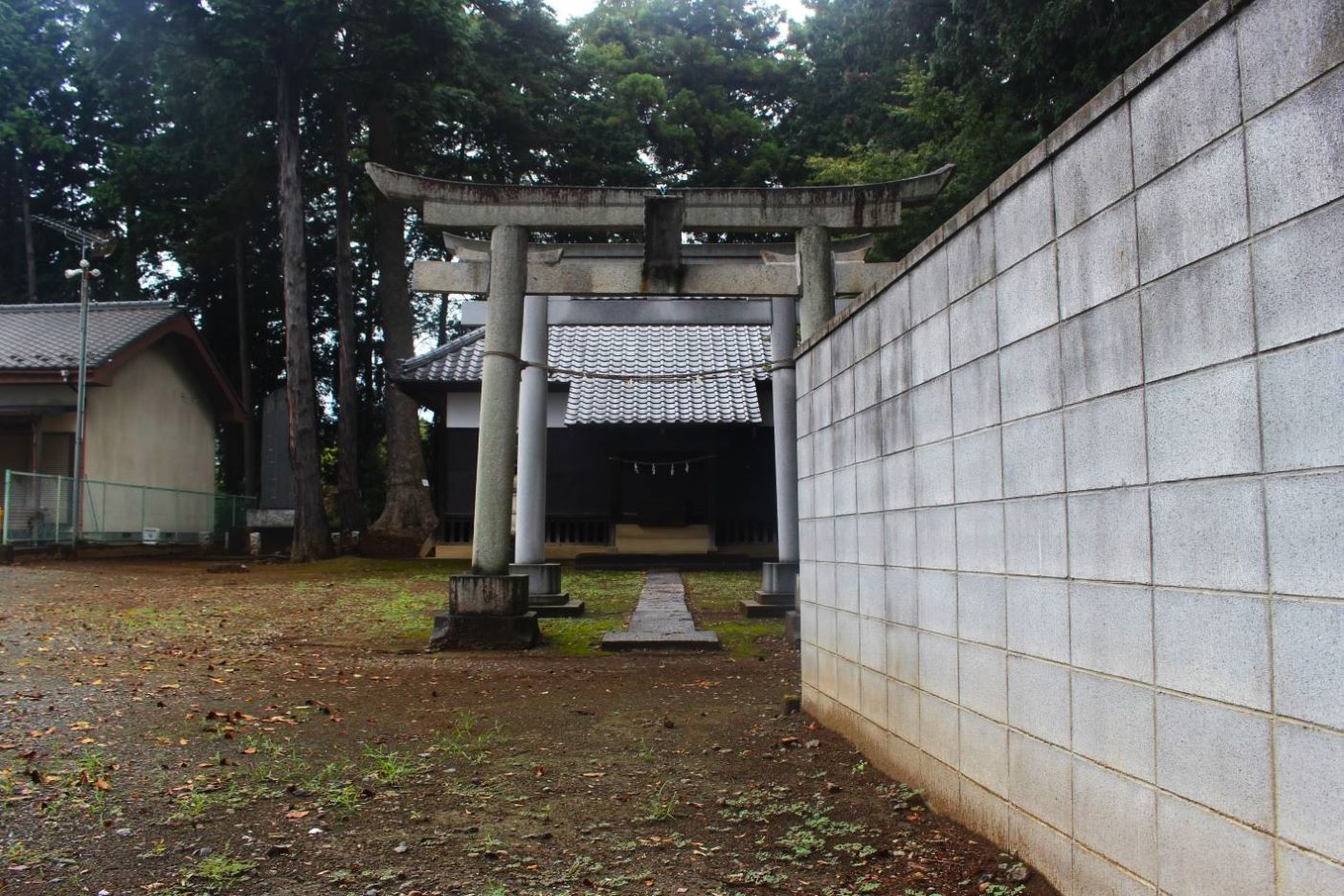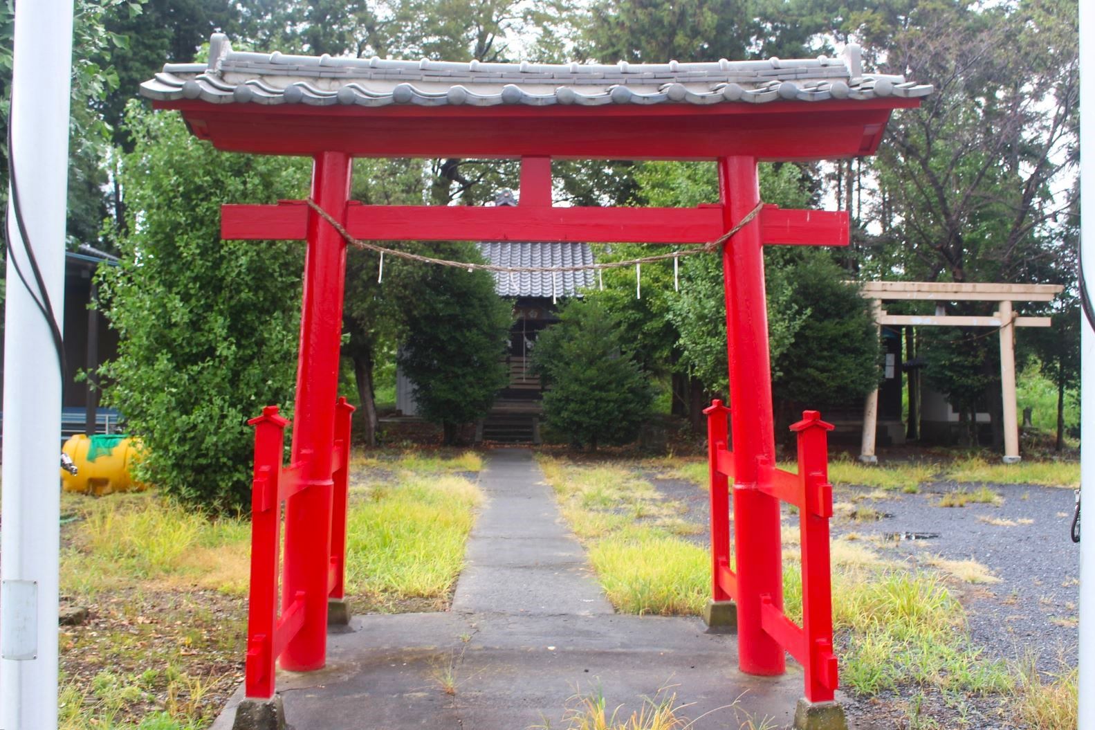 南北に参道が通り、その間には社叢林が広がる。 参道を少し進むと石製の鳥居がある。
