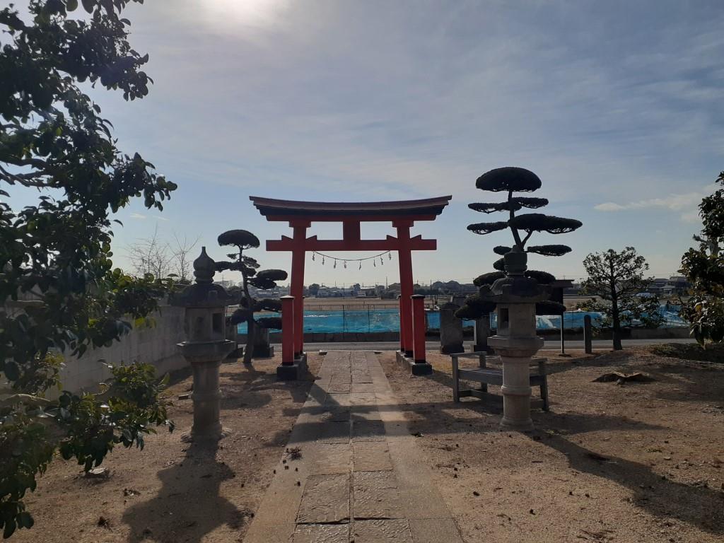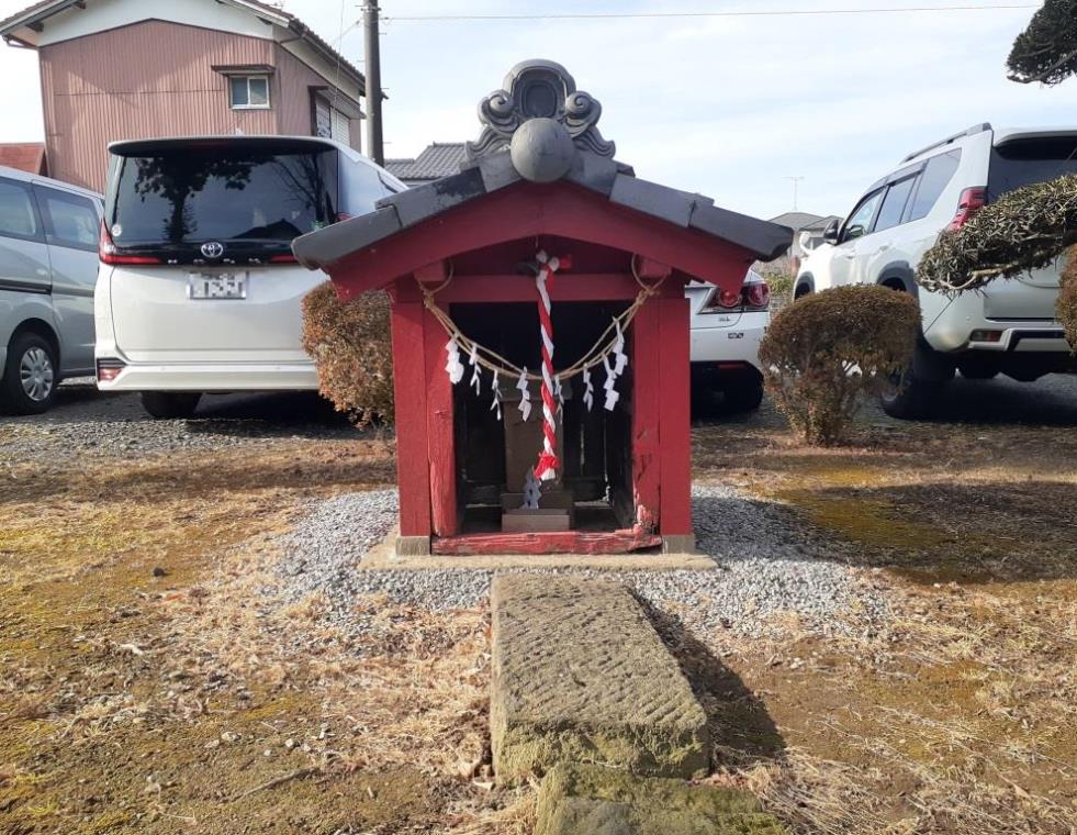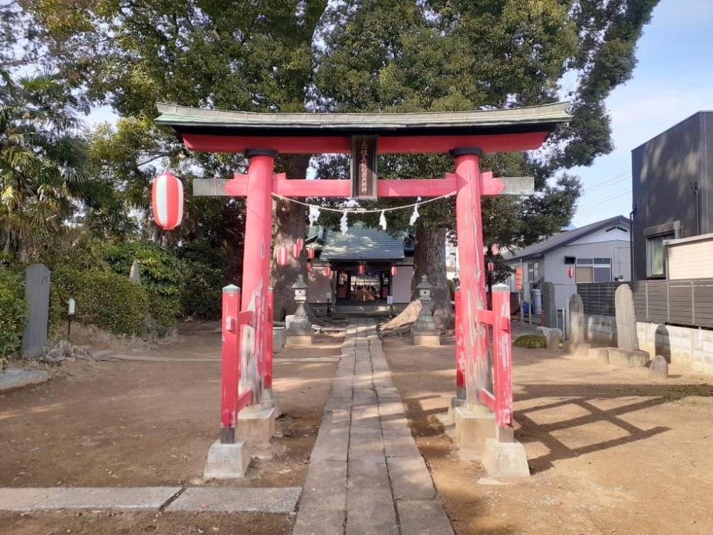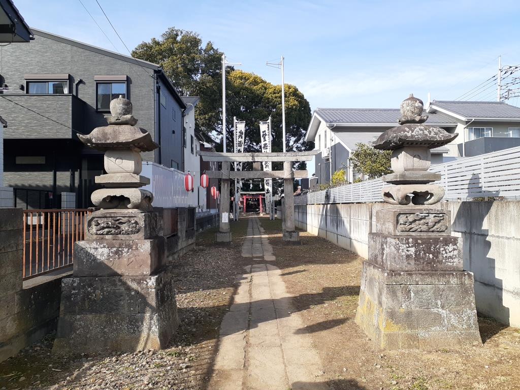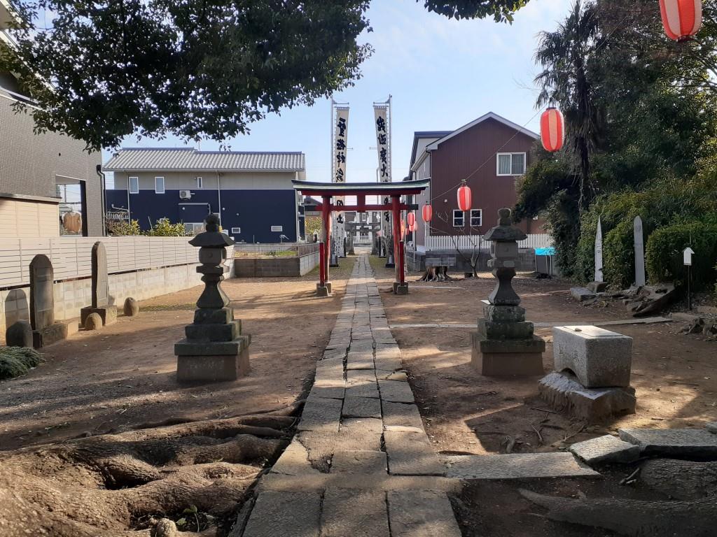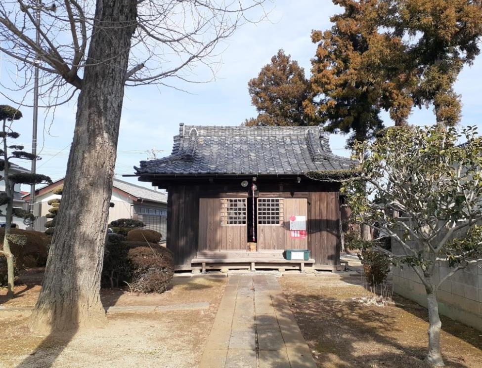 宮代町中島地域は、町東部に位置し、大落古利根川右岸の周囲一帯長閑な田畑風景が広がる地域で、地形を確認すると、大落古利根川のすぐ南側で河川に沿うように細長く形成されている微高地に集落は集中していて、社もその集落内に鎮座している。
