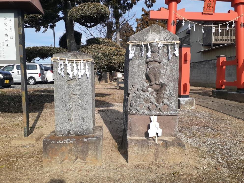 鳥居の手前で参道の左右にある庚申塔や青面金剛(写真左・右)