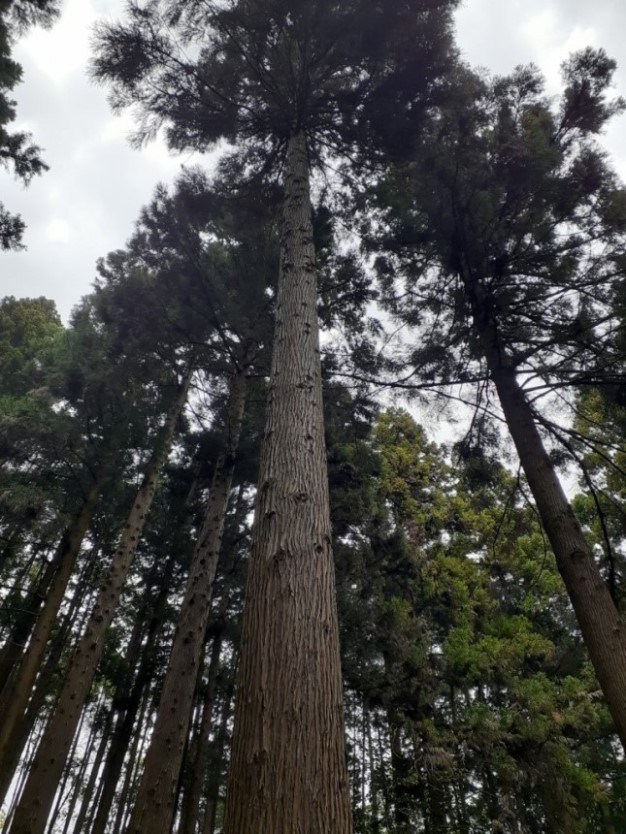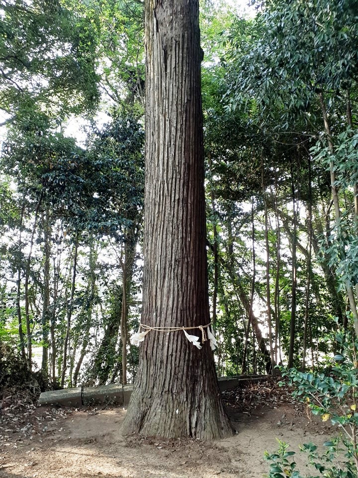巨石の間から聳えたつ大杉のご神木(写真左・右)。こちらには紙垂がしっかりと巻かれている。
