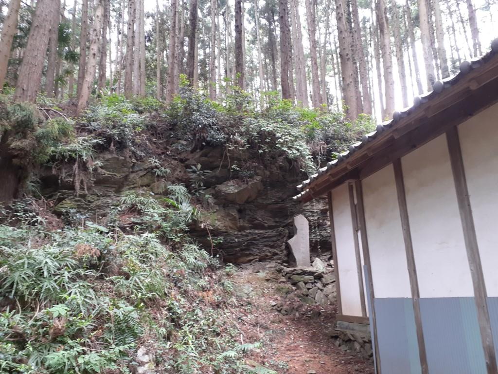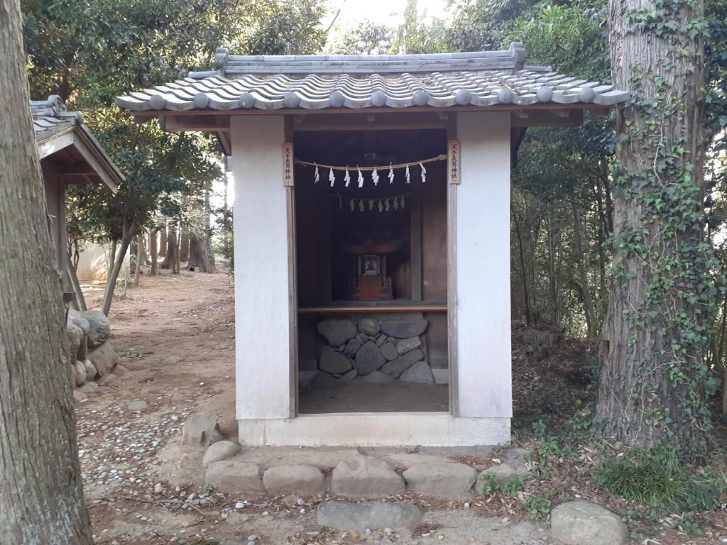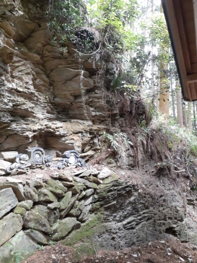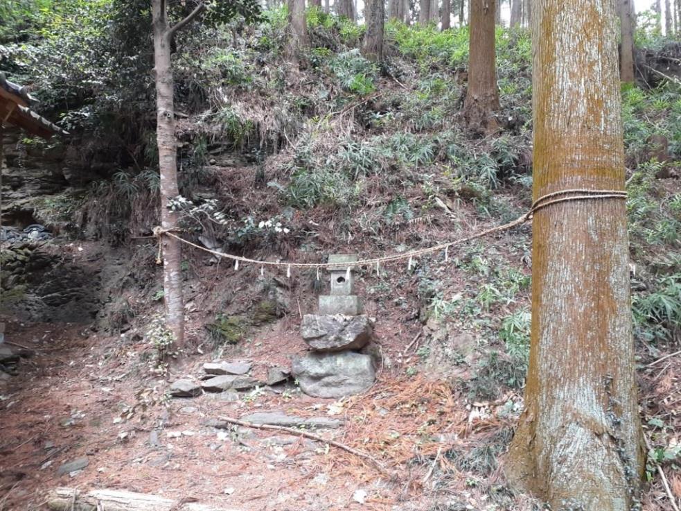 拝殿右側で石に挟まれた空間に鎮座する境内社 社殿の左側近隣に祀られている石祠
