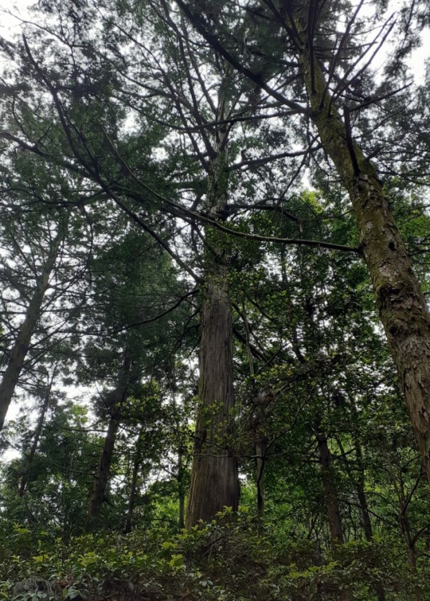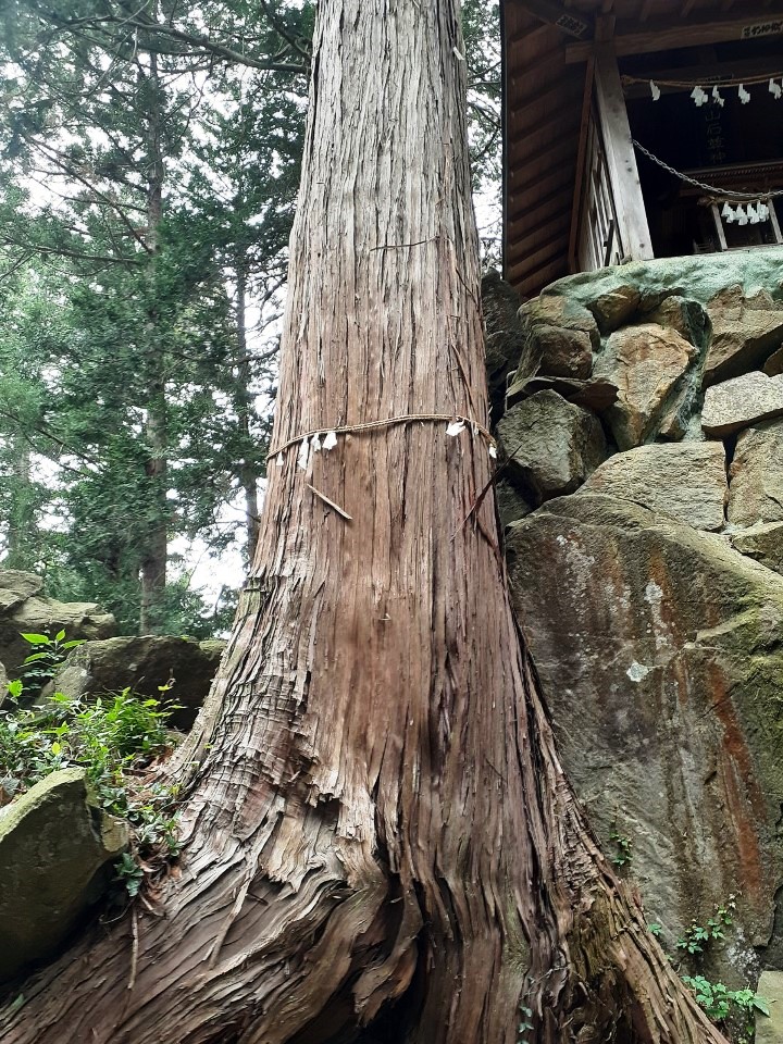 巨石の間から聳えたつ大杉のご神木(写真左・右)。こちらには紙垂がしっかりと巻かれている。