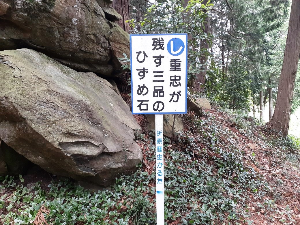 境内巨石群の右側手前には折原郷土カルタに表記されている「し 重忠が 残す三品の ひずめ石」の立看板があり(写真左)、その蹄跡を探したのだが、一向に分からず、高山石尊神社の後ろ側にある巨石のなだらかな面にそれらしき跡があった(同右)。但し筆者の勝手な解釈であることはお断りしておく。