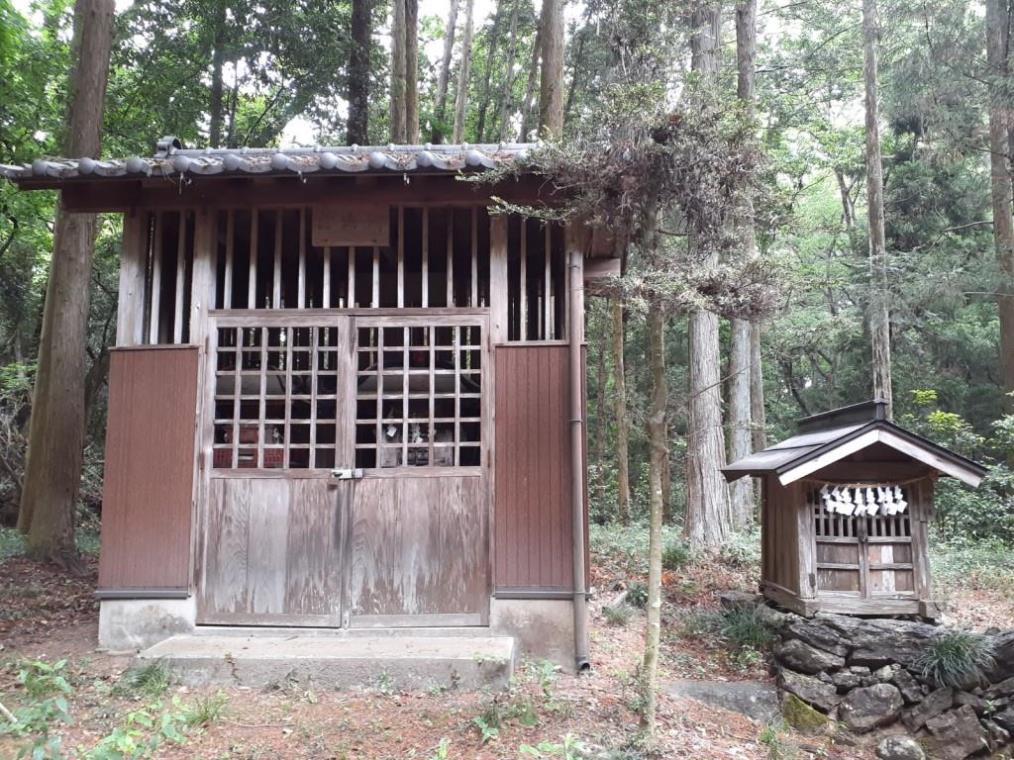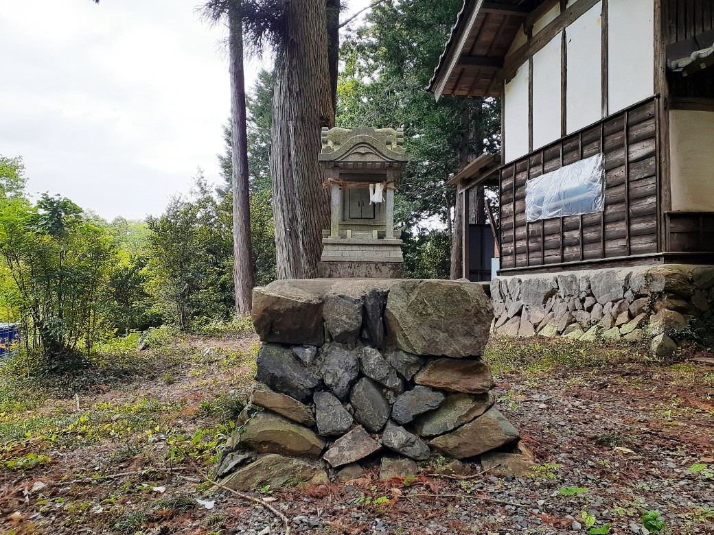 拝殿右側で石に挟まれた空間に鎮座する境内社 社殿の左側近隣に祀られている石祠