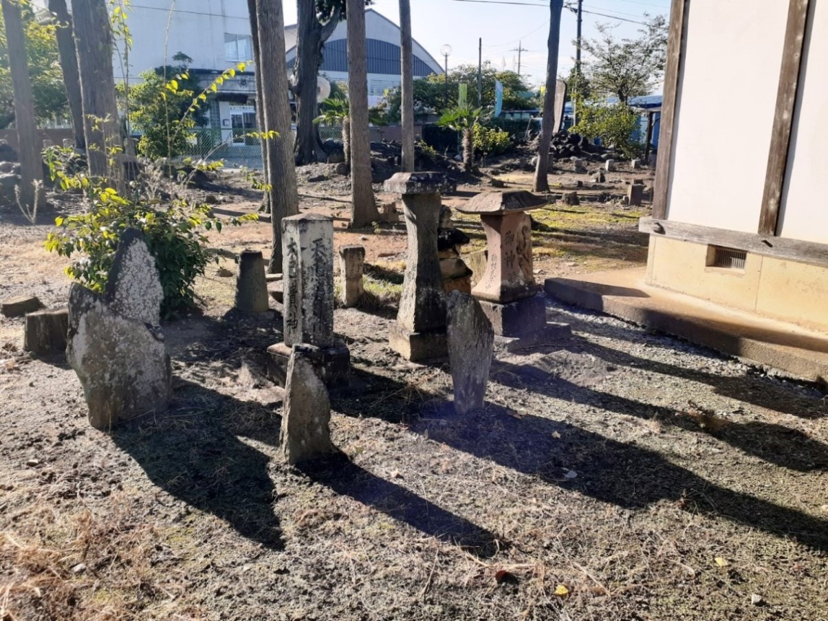 社殿の右側には数々の石製の記念碑がある。 記念碑の隣には3基の石祠が鎮座する。