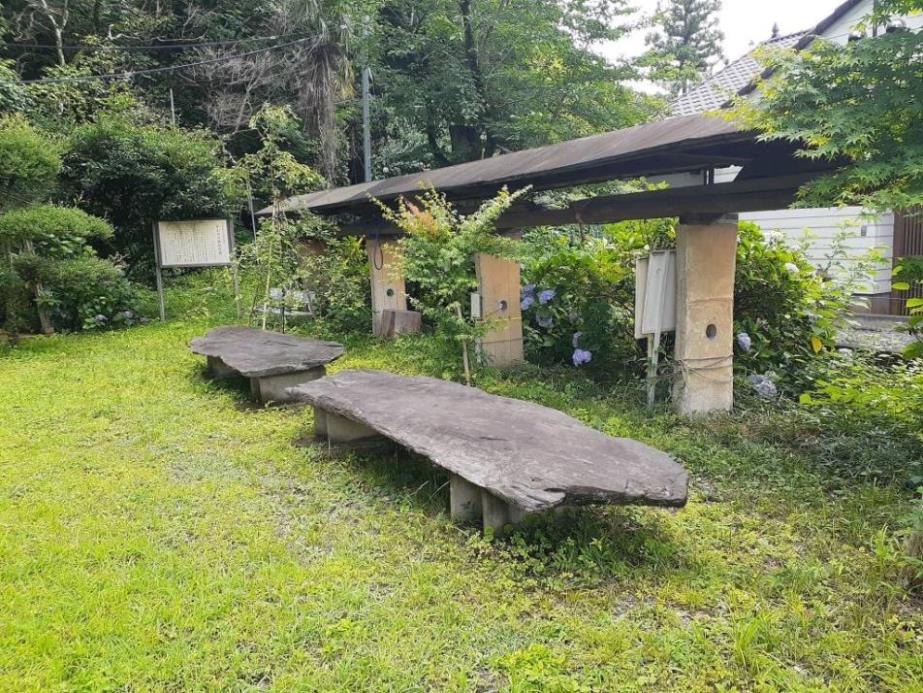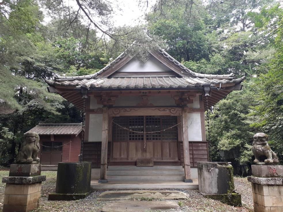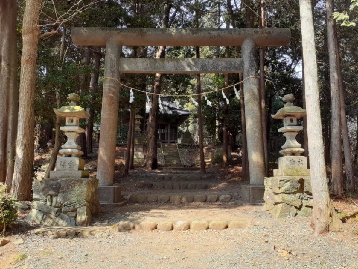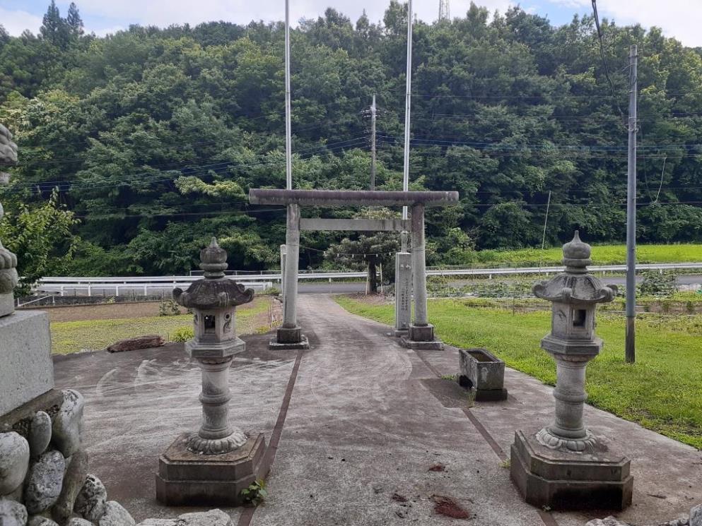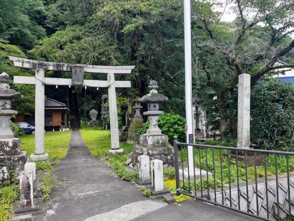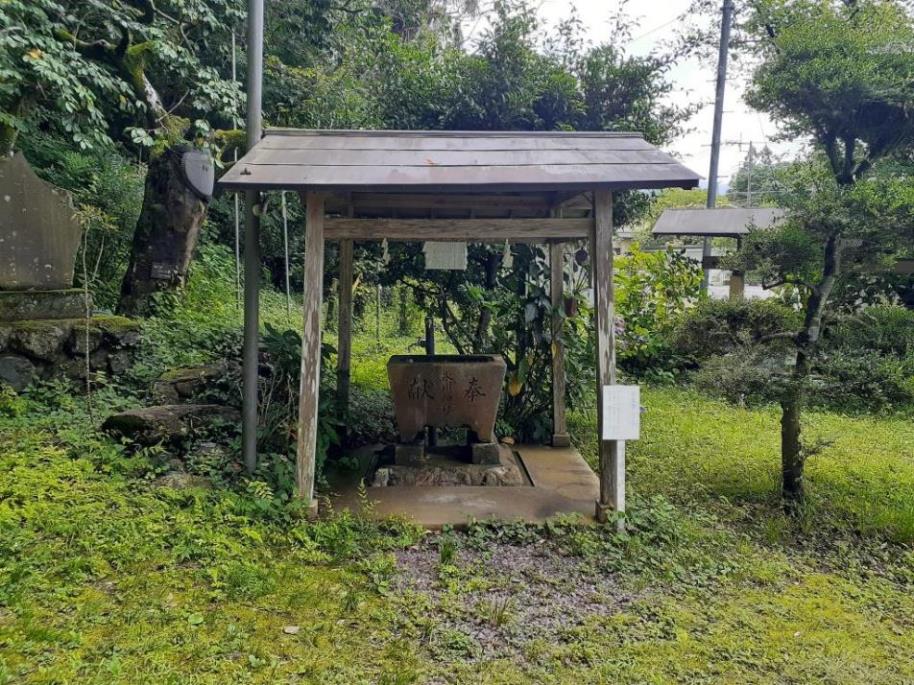 この境内に置かれている石板は「緑泥石片岩」であり、元々は、神社入口の用水路に架かる橋として使われていたものである。昭和58年頃の道路拡張工事に伴い、今ある場所に移して、ベンチとして利用されているという。