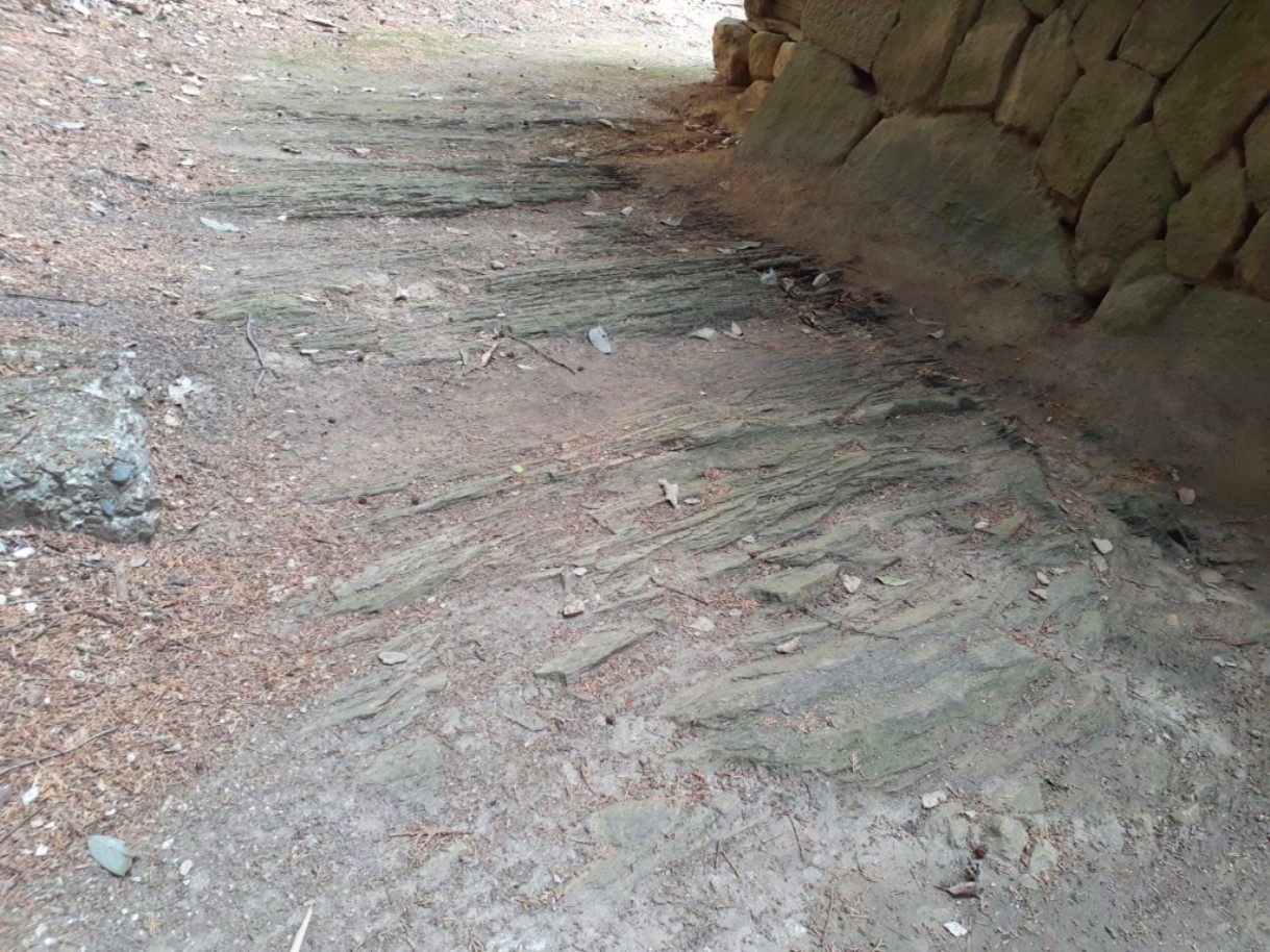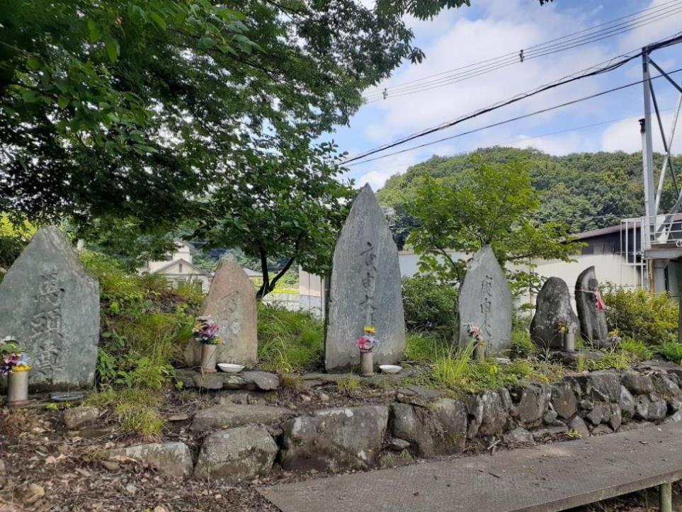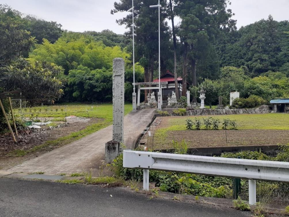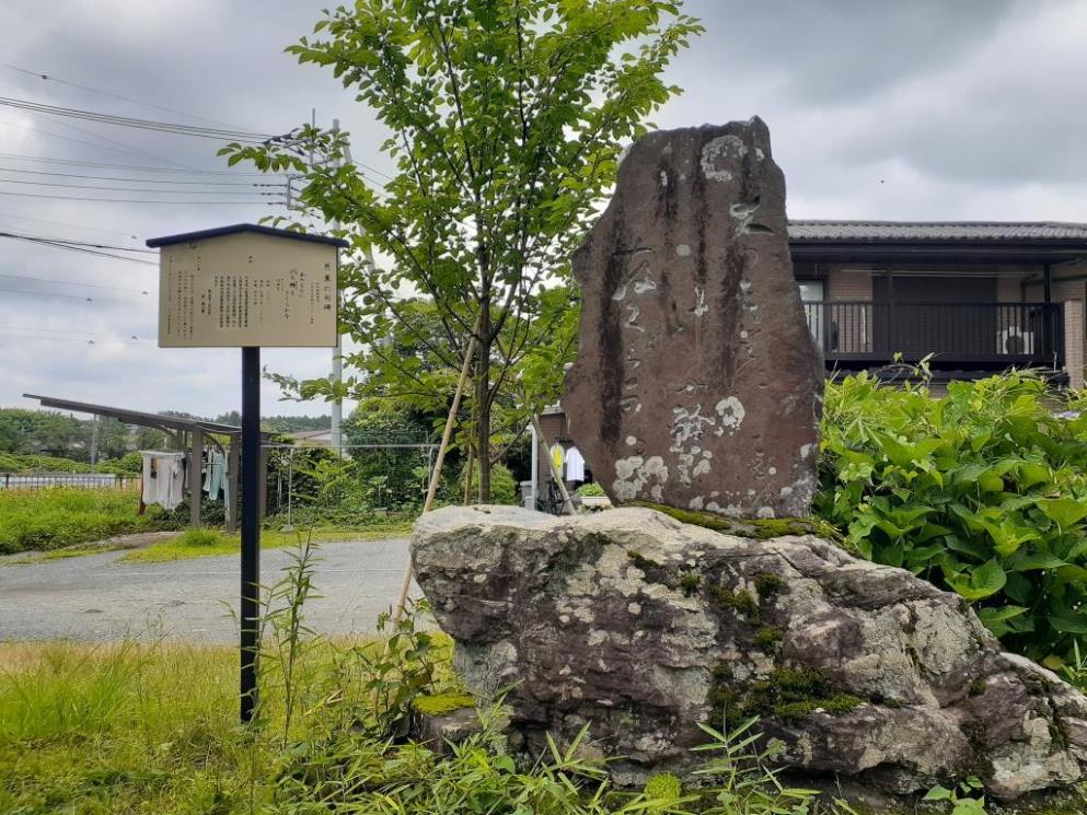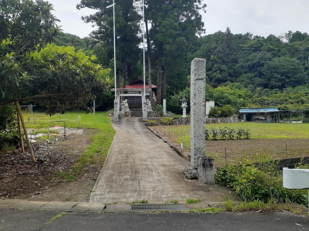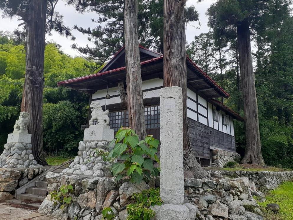 この境内に置かれている石板は「緑泥石片岩」であり、元々は、神社入口の用水路に架かる橋として使われていたものである。昭和58年頃の道路拡張工事に伴い、今ある場所に移して、ベンチとして利用されているという。