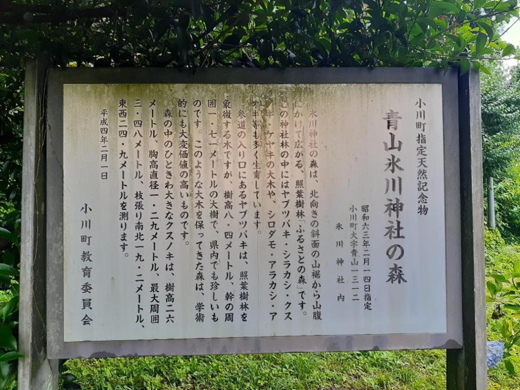 氷川神社の森は、北向きの斜面の山裾から山腹にかけて広がる、照葉樹林「ふるさとの森」です。この神社林の中にはヤブツバキ・シラカシ・クスノキ・ケヤキの大木や、シロダモ・アラカシ・アオキ等も多く生育しています。参道の入り口にあるヤブツバキは、照葉樹林を象徴する木ですが、樹高八・四メートル、幹の周囲一・七一メートルの大樹で、県内でも珍しいものです。このような大木を保ってきた森は、学術的にも大変価値の高いものです。