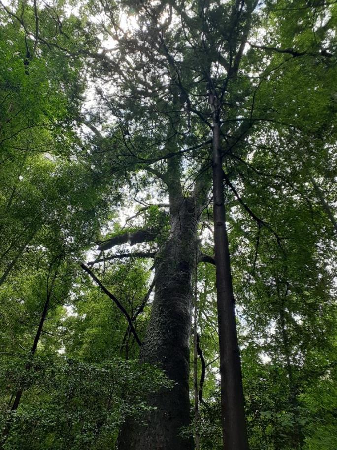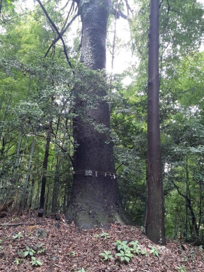 森の中のひときわ大きなクスノキは、樹高ニ六メートル、胸高直径一・二九メートル、最大周囲三・四八メートル、枝張り南北一九・ニメートル、東西二四・九メートルを測ります。