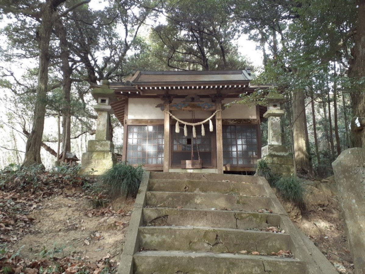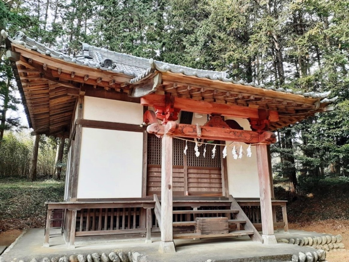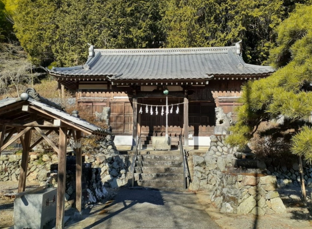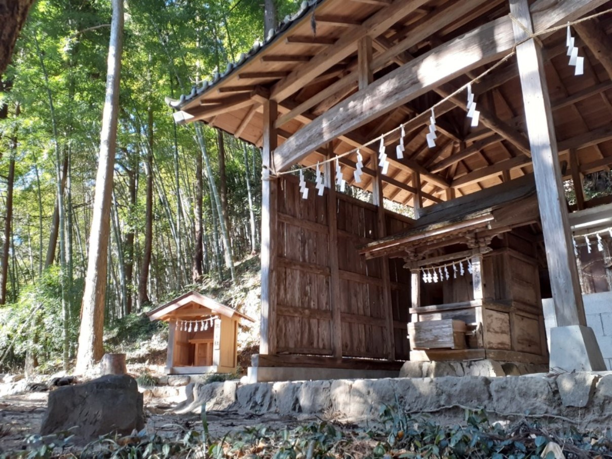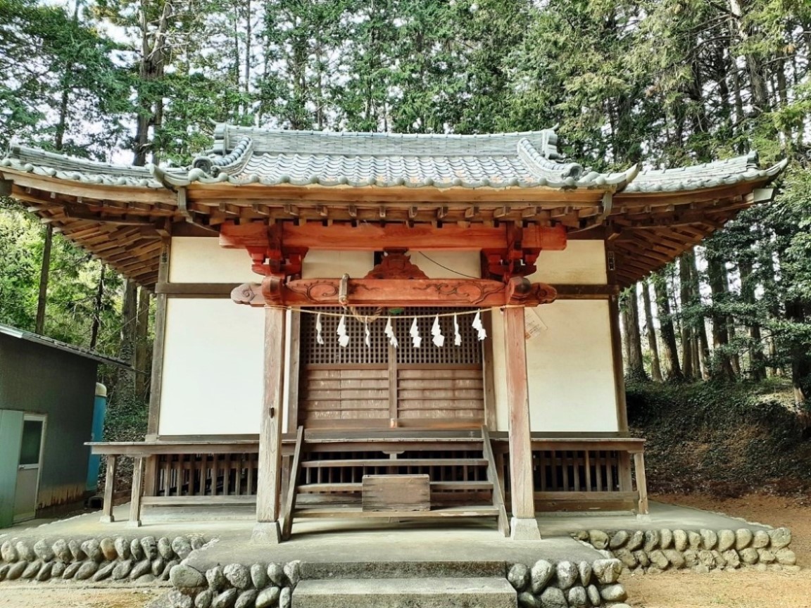 同寺の過去帳によると、松山城にいた三人の家老の一人、原川丹波守が落ち延びて隠れ住んだのが当地であったという。このころ当社も創建されたと伝わるが、『明細帳』には慶長四年(一五九九)に再建とあることから、当初は恐らく小さな祠であったのであろう。その後、次第に村民の信仰を集め、当村独立の際に村の鎮守として位置づけられたと思われる。境内にある「たもと石」と呼ばれる高さ五〇センチメートルほどの円柱形の石は、丹波守が松山城から落ち延びた時に袂に入れて持ち出したものと言われ、例祭には注連縄を張って祭典を行っている。