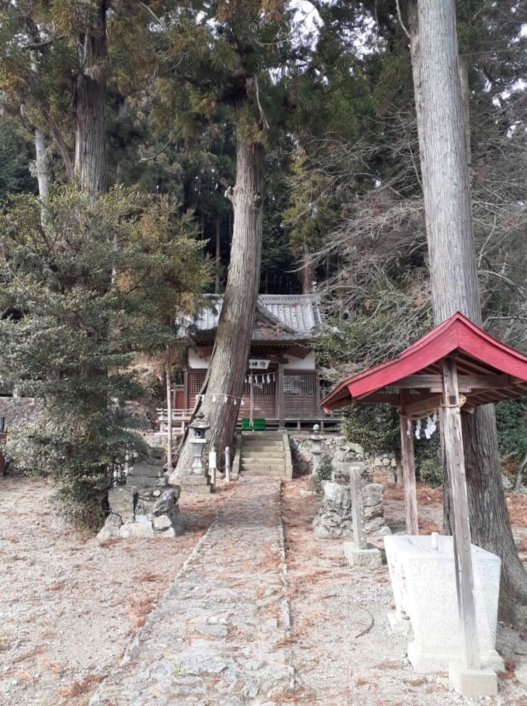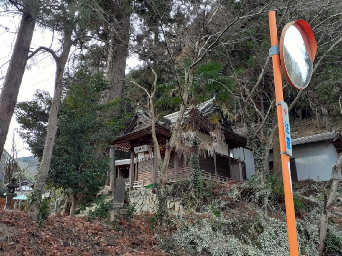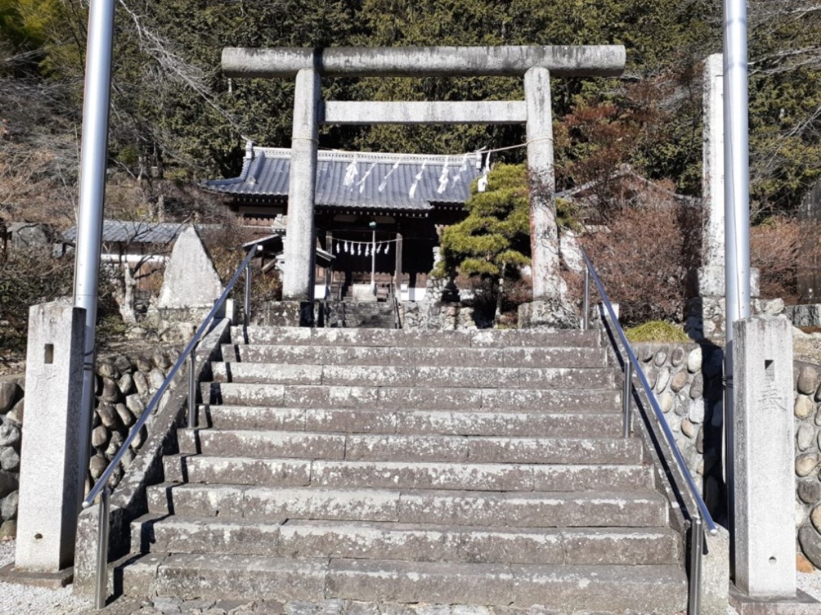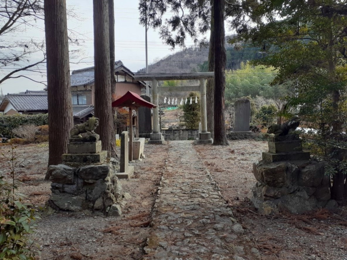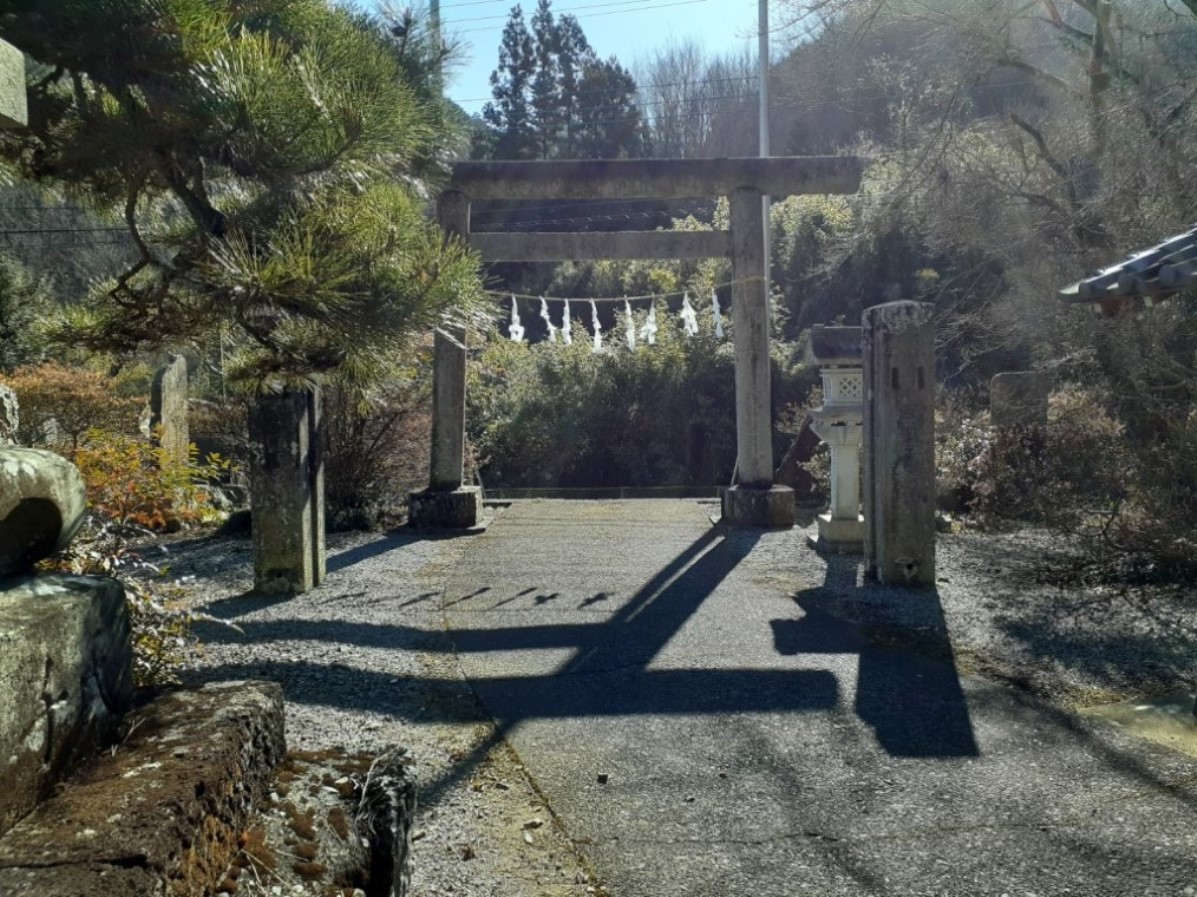 同寺の過去帳によると、松山城にいた三人の家老の一人、原川丹波守が落ち延びて隠れ住んだのが当地であったという。このころ当社も創建されたと伝わるが、『明細帳』には慶長四年(一五九九)に再建とあることから、当初は恐らく小さな祠であったのであろう。その後、次第に村民の信仰を集め、当村独立の際に村の鎮守として位置づけられたと思われる。境内にある「たもと石」と呼ばれる高さ五〇センチメートルほどの円柱形の石は、丹波守が松山城から落ち延びた時に袂に入れて持ち出したものと言われ、例祭には注連縄を張って祭典を行っている。