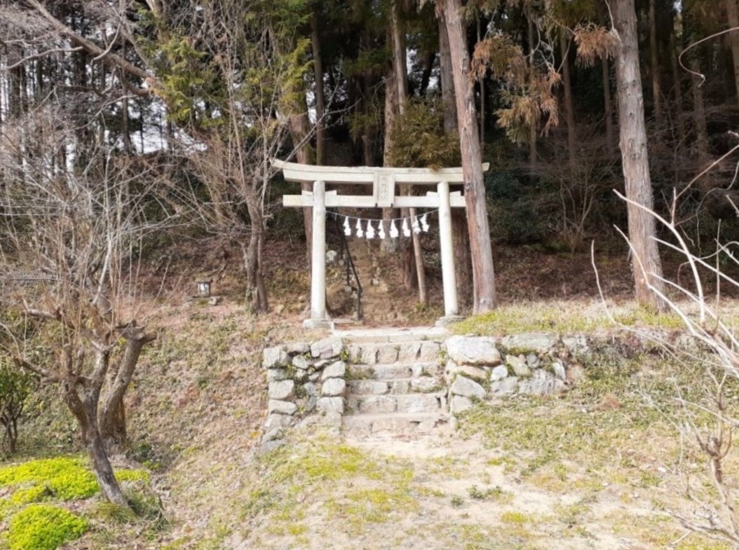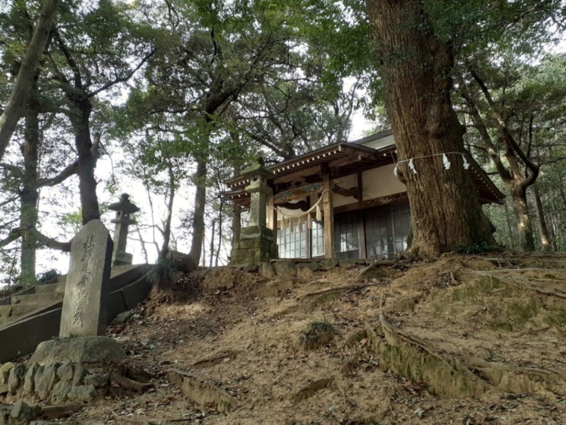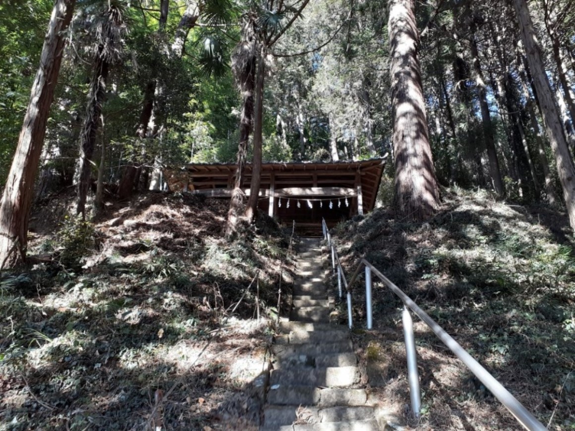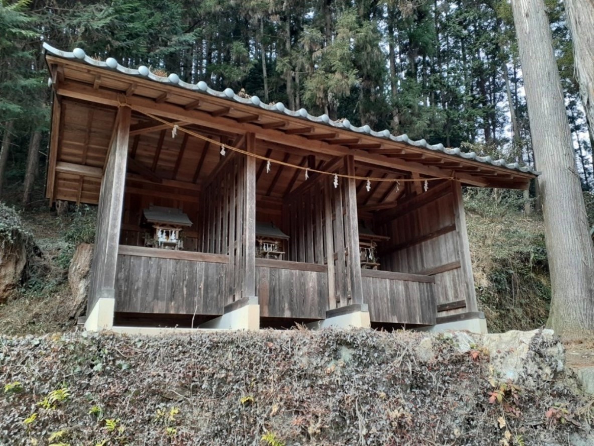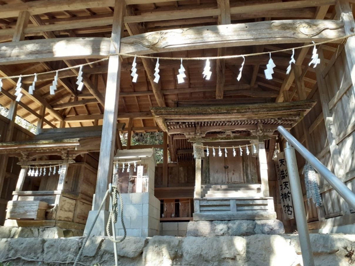 同寺の過去帳によると、松山城にいた三人の家老の一人、原川丹波守が落ち延びて隠れ住んだのが当地であったという。このころ当社も創建されたと伝わるが、『明細帳』には慶長四年(一五九九)に再建とあることから、当初は恐らく小さな祠であったのであろう。その後、次第に村民の信仰を集め、当村独立の際に村の鎮守として位置づけられたと思われる。境内にある「たもと石」と呼ばれる高さ五〇センチメートルほどの円柱形の石は、丹波守が松山城から落ち延びた時に袂に入れて持ち出したものと言われ、例祭には注連縄を張って祭典を行っている。