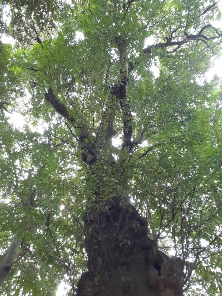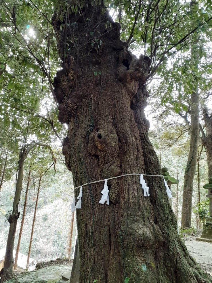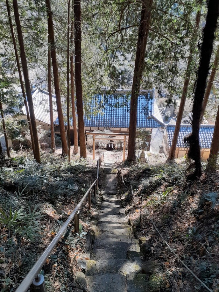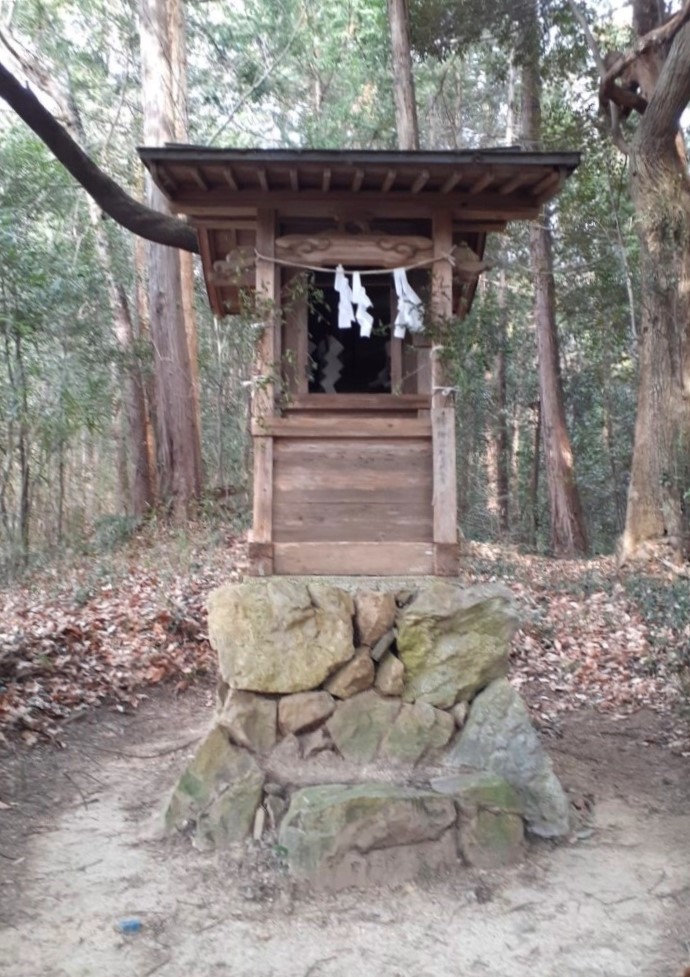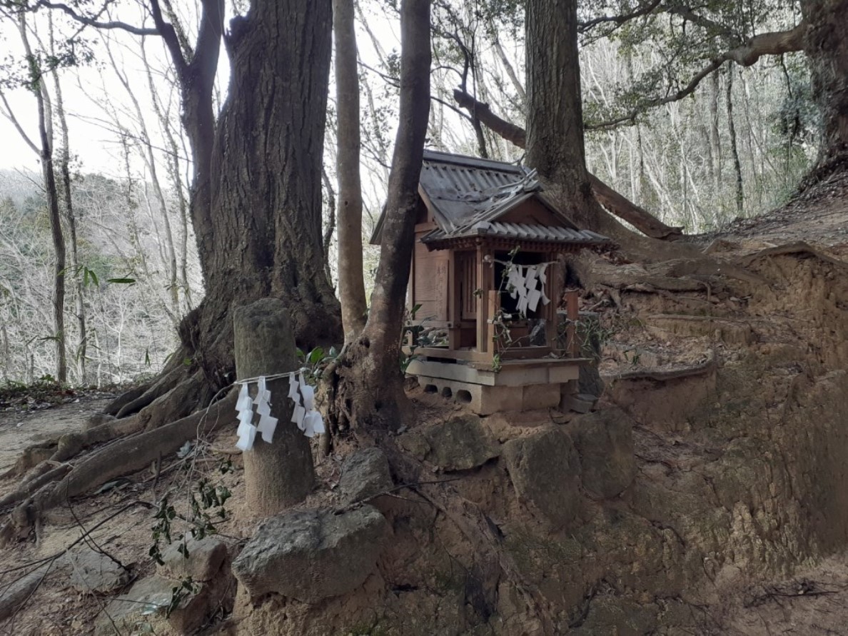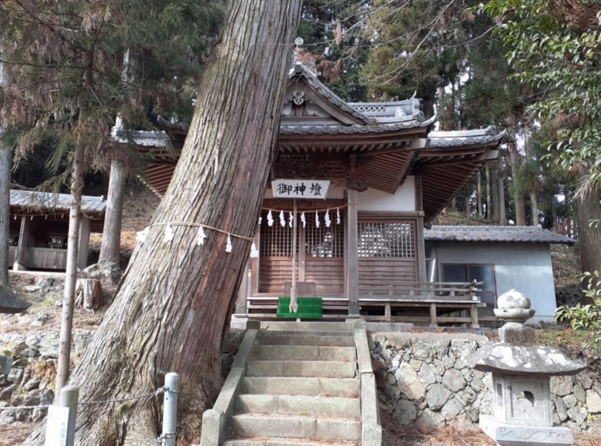 同寺の過去帳によると、松山城にいた三人の家老の一人、原川丹波守が落ち延びて隠れ住んだのが当地であったという。このころ当社も創建されたと伝わるが、『明細帳』には慶長四年(一五九九)に再建とあることから、当初は恐らく小さな祠であったのであろう。その後、次第に村民の信仰を集め、当村独立の際に村の鎮守として位置づけられたと思われる。境内にある「たもと石」と呼ばれる高さ五〇センチメートルほどの円柱形の石は、丹波守が松山城から落ち延びた時に袂に入れて持ち出したものと言われ、例祭には注連縄を張って祭典を行っている。