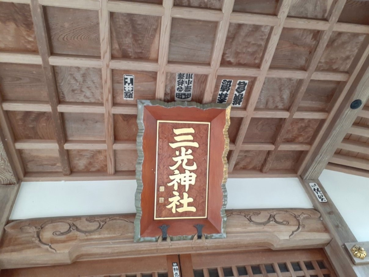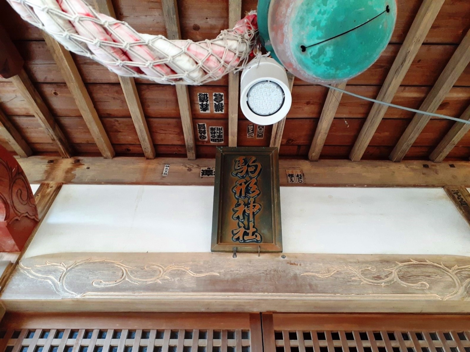 拝殿に掲げている「駒形神社」扁額 石碑には仙元大神宮。その奥には稲荷社。