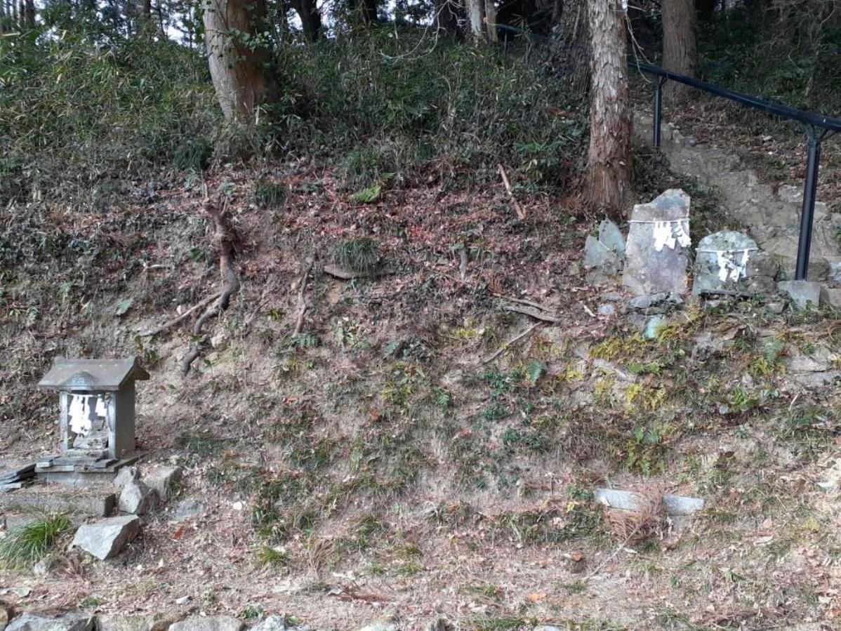 参道北側の斜面一角に平地があり、地蔵尊、法印墓石等が建つことから、かつての別当があったことが推察される。丹波守の後裔にあたる原川健家で現在祀られている雌雄の木彫りの馬は、この当時の神体であり、神仏分離により原川家に預けられた。左甚五郎の作と伝え、夜毎作物を食い荒らすので、古くは鎖に繋がれていたという。