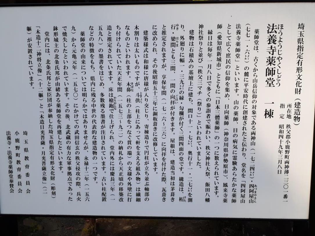両神神社と法養寺薬師堂は隣接している。法養寺薬師堂は秩父十三仏・第7番札所でもあり、日本三大薬師尊ともいう。
