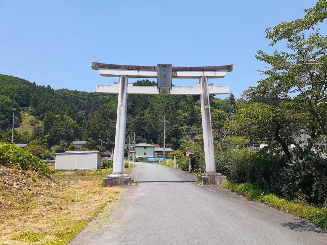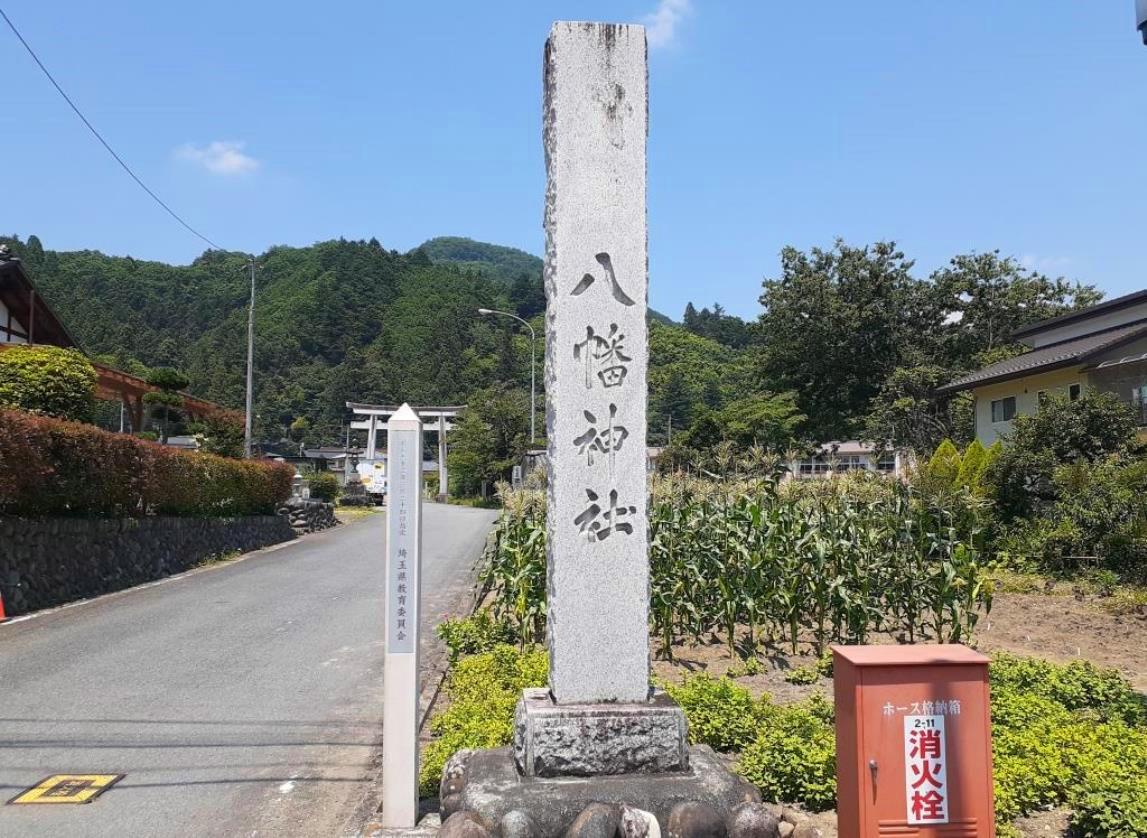 小鹿野町・小鹿神社の大鳥居がある場所から国道299号線を3㎞程西行すると、進行方向右手に社の社号標柱がみえ、そこを右折すると、飯田八幡神社の石製の鳥居が見えてくる。