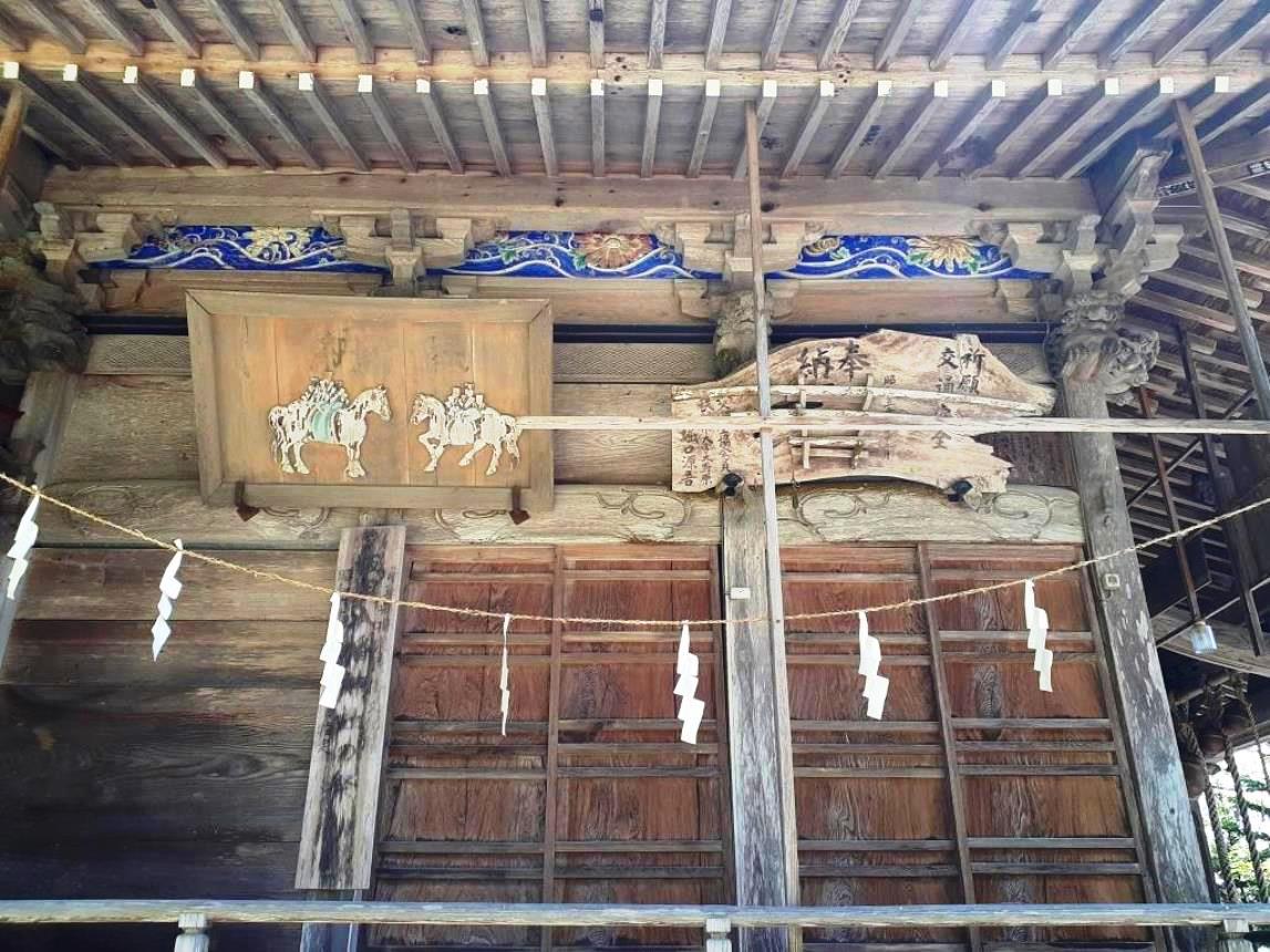 拝殿正面上部には細やかな彫刻が施されている。 側面部上部にはまだ彩色も残り、奉納された