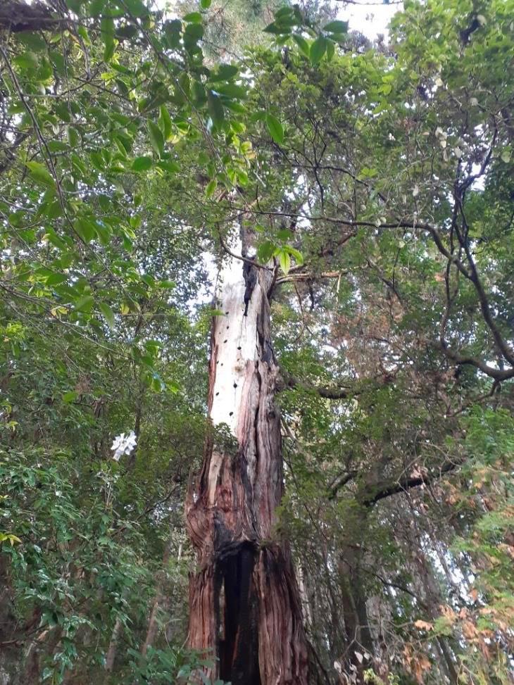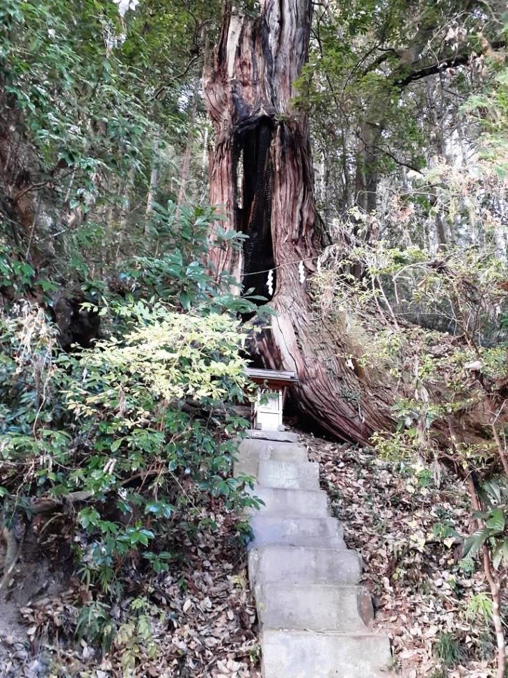 社殿に向かって右側に、注連縄のついた御神木である大杉が見える。樹齢は1,300年と伝えている。幹の中央部には、大きな焼け跡ある空洞が見える。昭和19年8月13日の落雷により、中央部は裂けてしまい、幹下部は洞となったようだ。