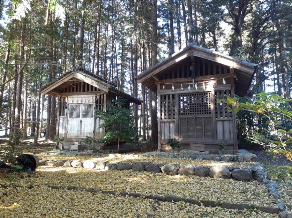 正面の建物は拝殿を兼ねた覆屋であり、本殿はその中に納められている。