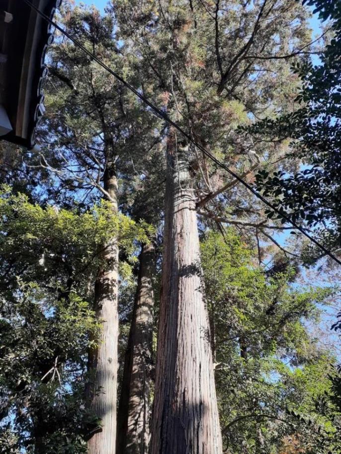 拝殿覆屋の傍らに聳え立つご神木(写真左・右)
