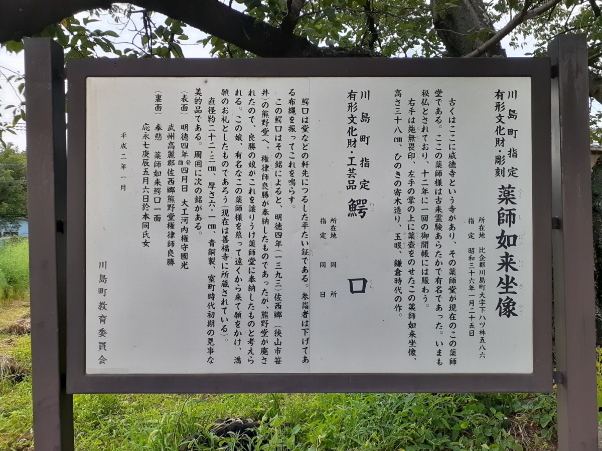 この鰐口はその銘によると、明徳四年(一三九三)佐西郷(狭山市笹井)の熊野堂へ、權律師良勝が奉納したものであったが、熊野堂が廃されたので、良勝の娘がこれを譲りうけ薬師堂に奉献したものと考えられる。この娘、有名なこの薬師様を慕って遠くから来て願をかけ、満願のお礼としたものであろう(現在は善福寺に所蔵されている)。