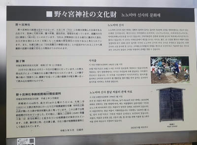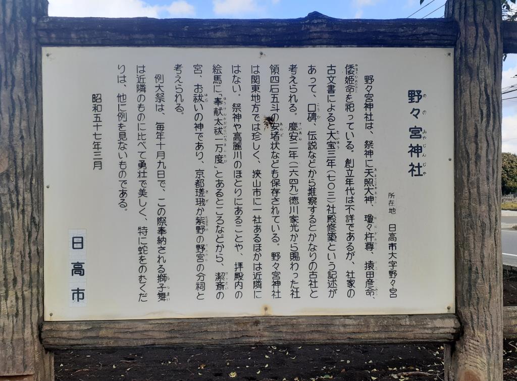 野々宮神社は、祭神に天照大神、瓊々杵尊、猿田彦命、倭姫命を祀っている。創立年代は不詳であるが、社家の古文書によると大宝三年(七〇三)社殿修築という記述があって、口碑、伝説などがら推察するとがなりの古社と考えられる。慶安二年(一六四九)徳川家光から賜わった社領四石五斗の安堵状なども保存されている。野々宮神社は関東地方では珍しく、狭山市に一社あるほかは近隣にはない。祭神や高麗川のほとりにあることや、拝殿内の絵馬に「奉献太祓一万度」とあるところなどから、潔斎(決済)の宮・お祓いの神であり、京都嵯峨か紫野(むらさきの)の野宮の分祠と考えられる。