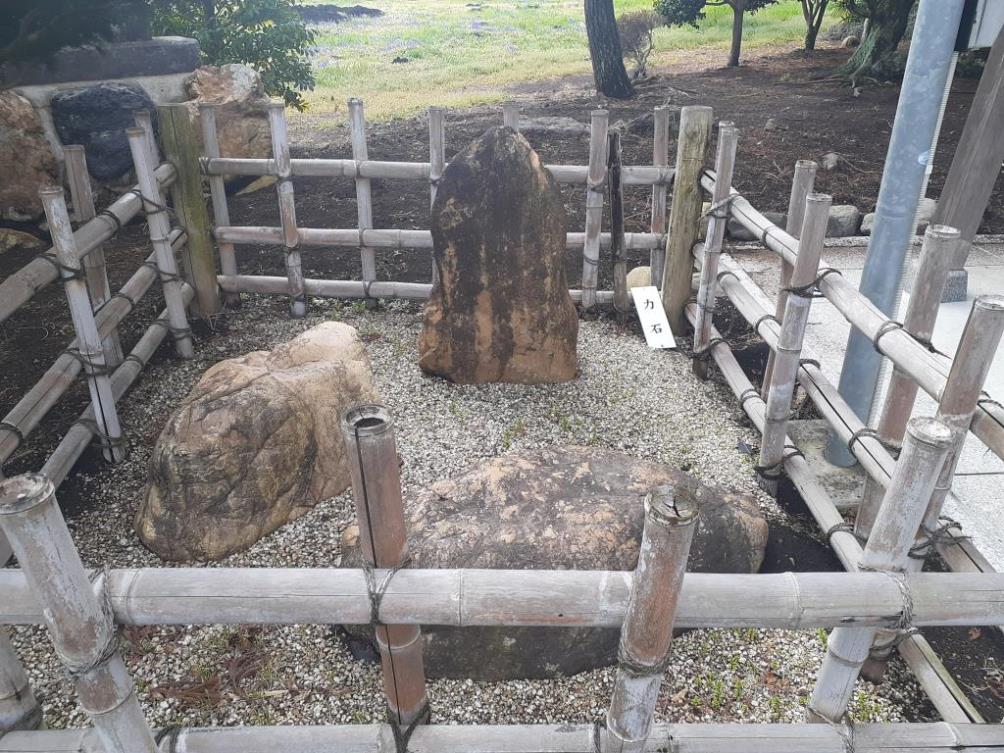 拝殿前にあり、四方を柵で保管されている力石          本 殿