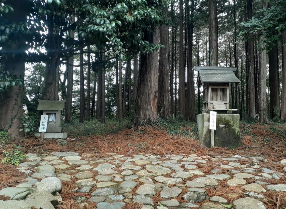 本殿奥に祀られている石祠と境内社。左より大山祇社・特潜神社